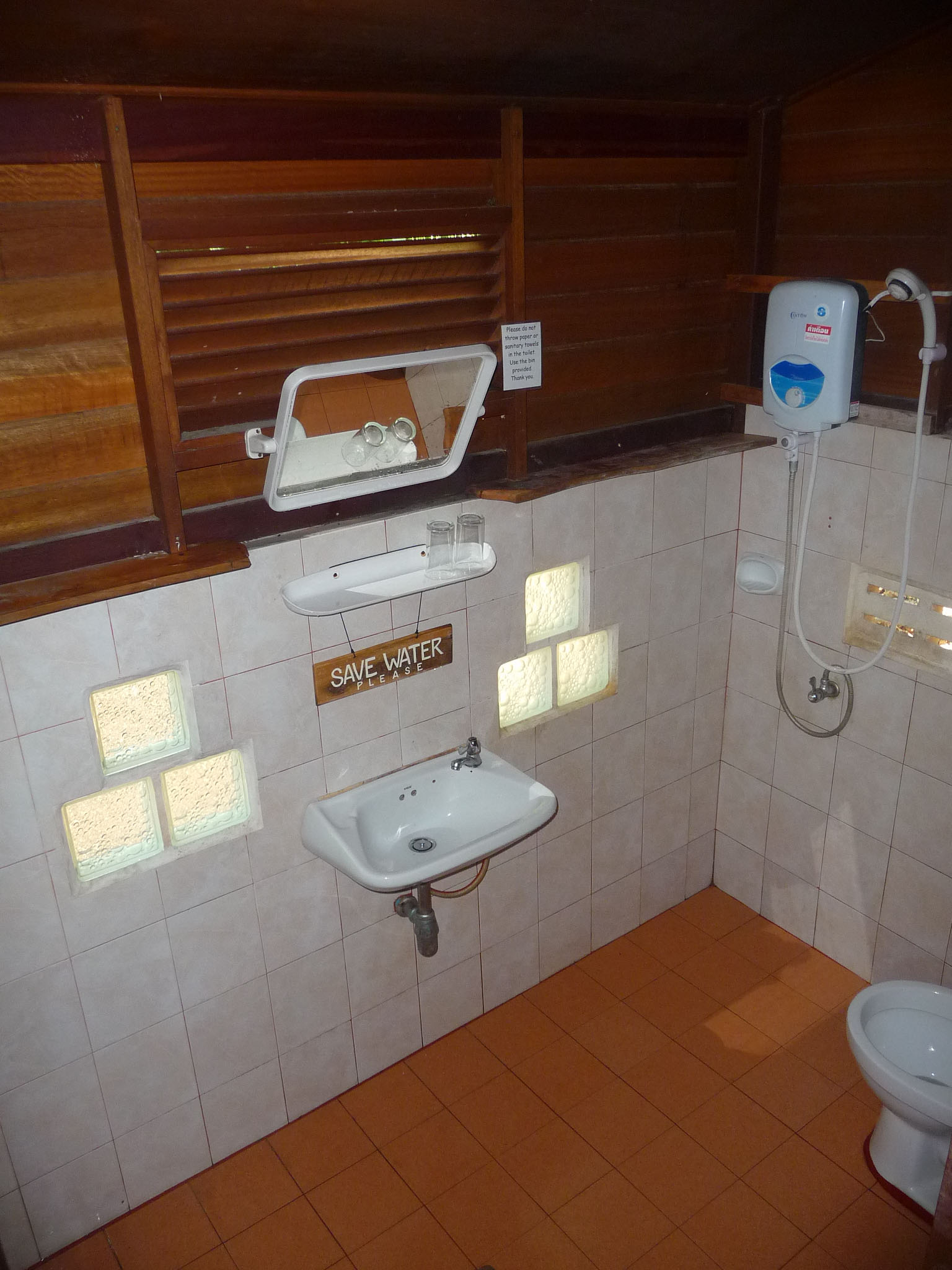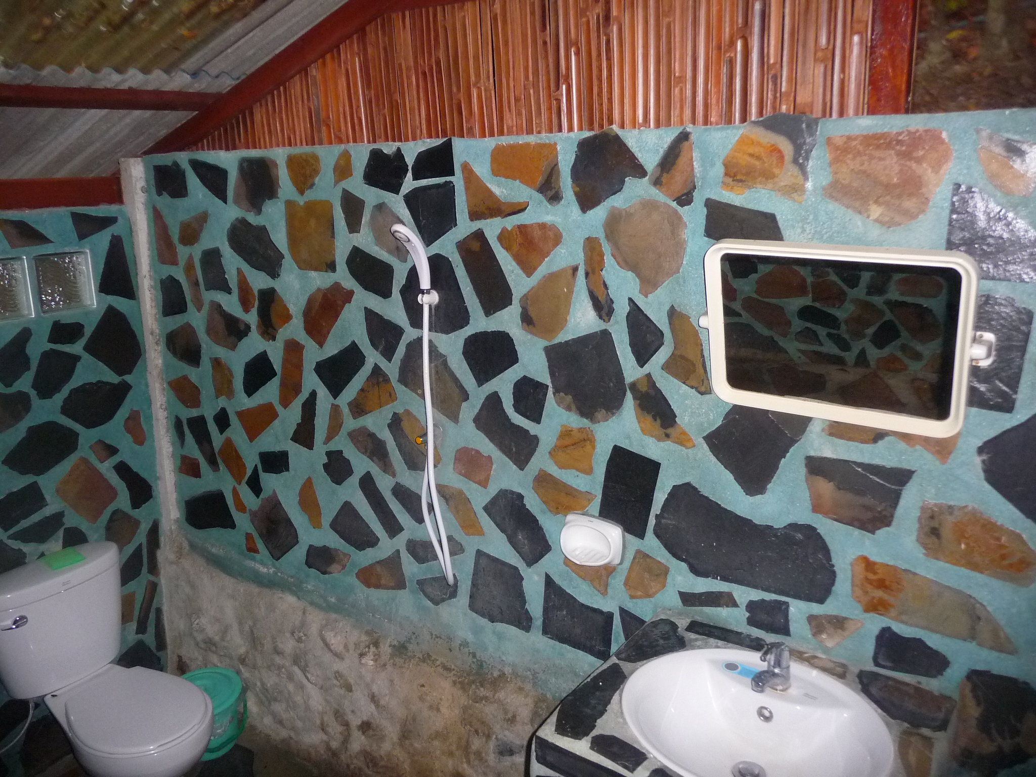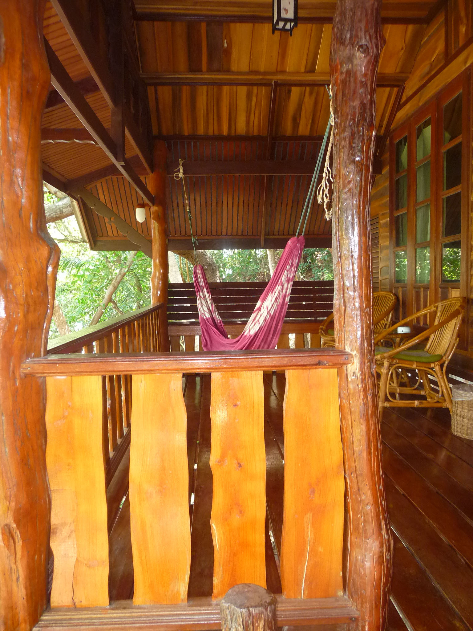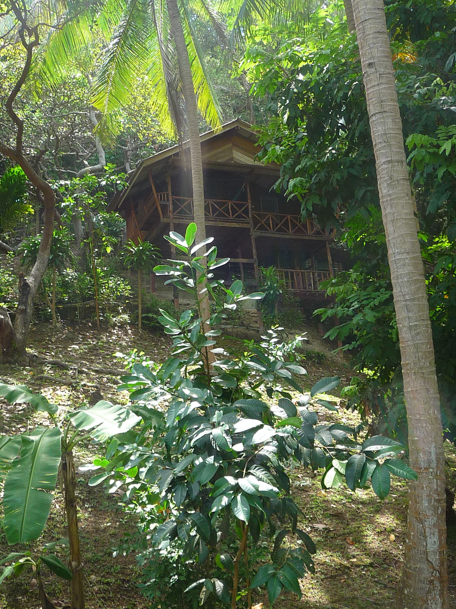 Holzbungalows im Hang. Der Blick ist zum Teil phantastisch: hier sieht man den ganzen Long Beach und die Felsformationen im Meer.