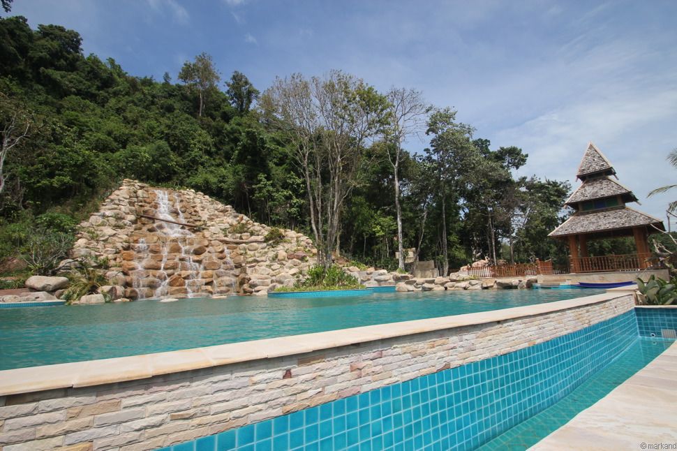 Wie schon bei dem bekannten Santhiya Resort auf Ko Pha Ngan, liegen die geräumigen schönen Bungalows versteckt im Hang, unten am Strand befindet sich ein riesiger Pool mit Meerblick und künstlichem Wasserfall. Zudem ein Restaurantbereich und viele Liegen.