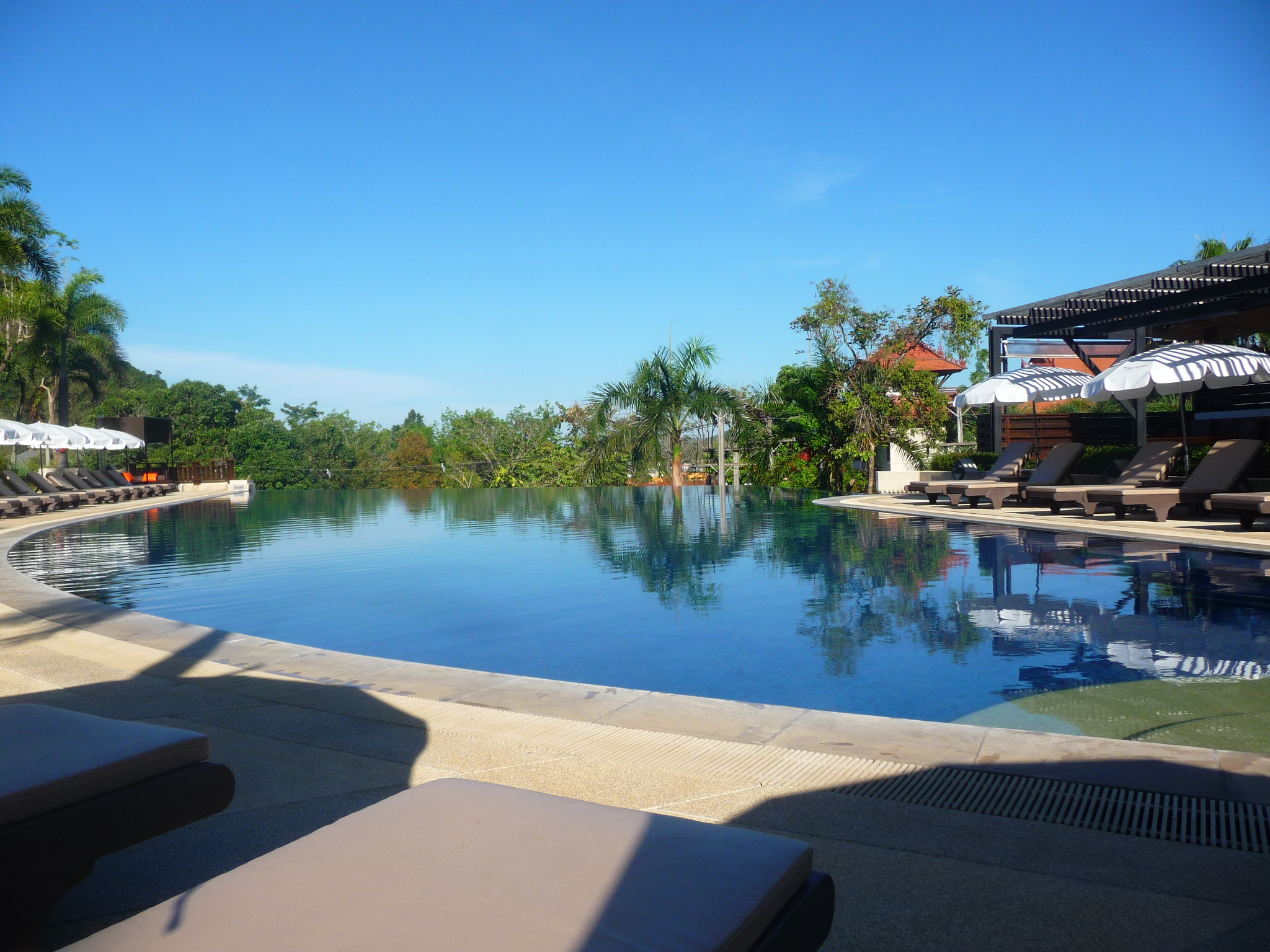 Inmitten der schön begrünten Anlage liegt der große infinity Pool. Viele Liegen und Platz zum Sonnenbaden.