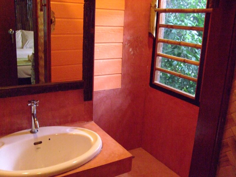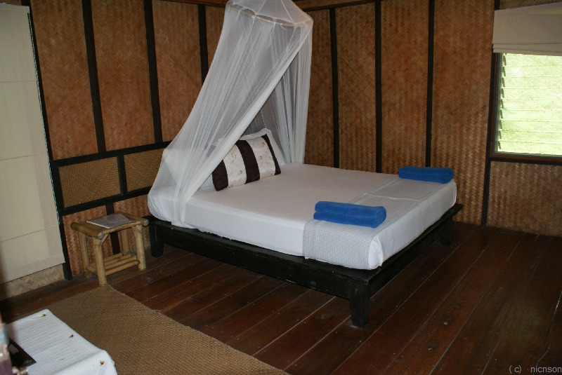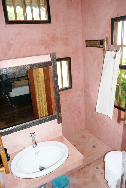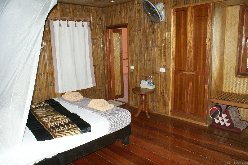 Ganz am Ende der Bucht im Hang schöne geschmackvoll eingerichtete Holzbungalows.