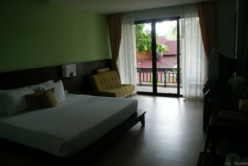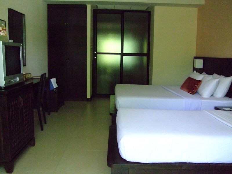 Geschmackvolle dezente Ausstattung in Schwarz-Weiß und dunklem Holz mit AC, TV, Badewanne und Wasserkocher.