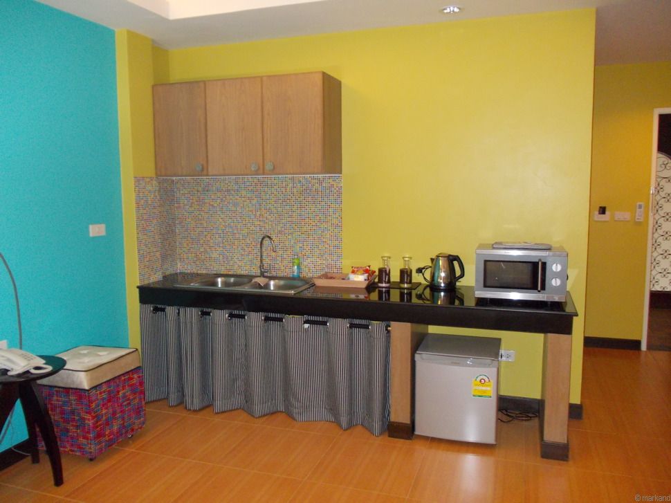 Alle Zimmer haben eine kleine Küche (Mikrowelle, Geschirr, Kühlschrank und Wasserkocher) und schöne Badezimmer.