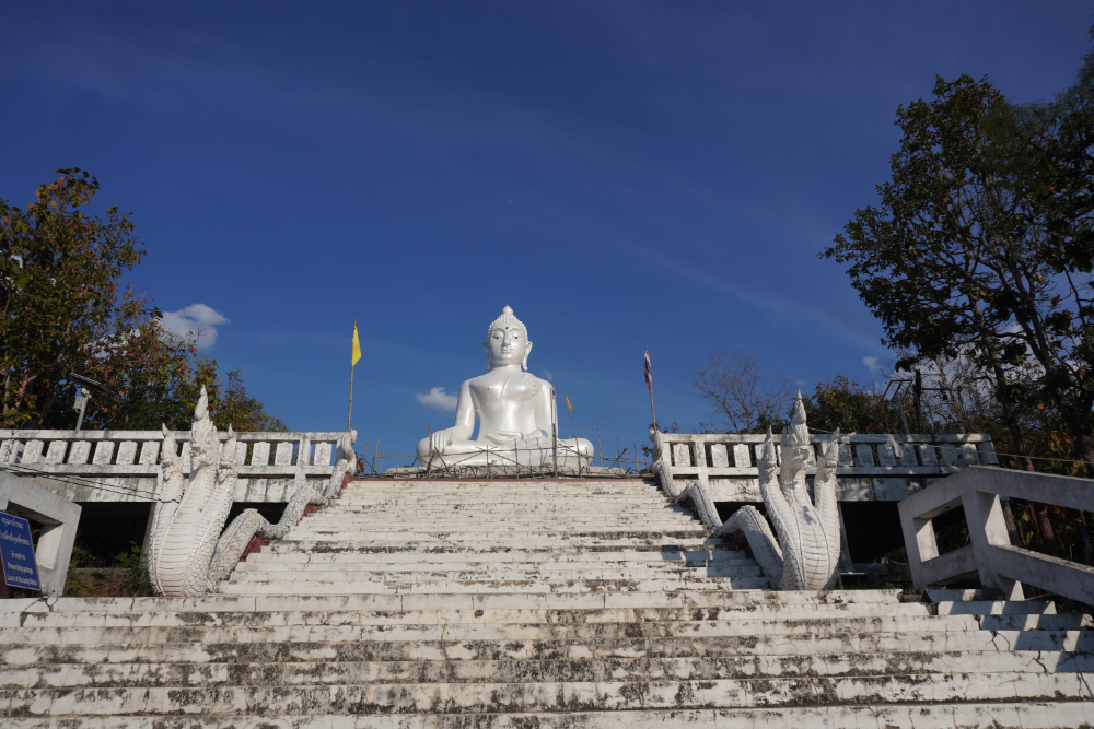 Eigentlich jeder marschiert zudem zum Big Buddha (auf der Karte S. 395 und im Text zur Motorradtour erwähnt) über dem Wat Phra That Mae Yen. Besonders abends wird er schön angestrahlt von der untergehenden Sonne. Leider darf man nur bis 18 Uhr dort oben verweilen.
