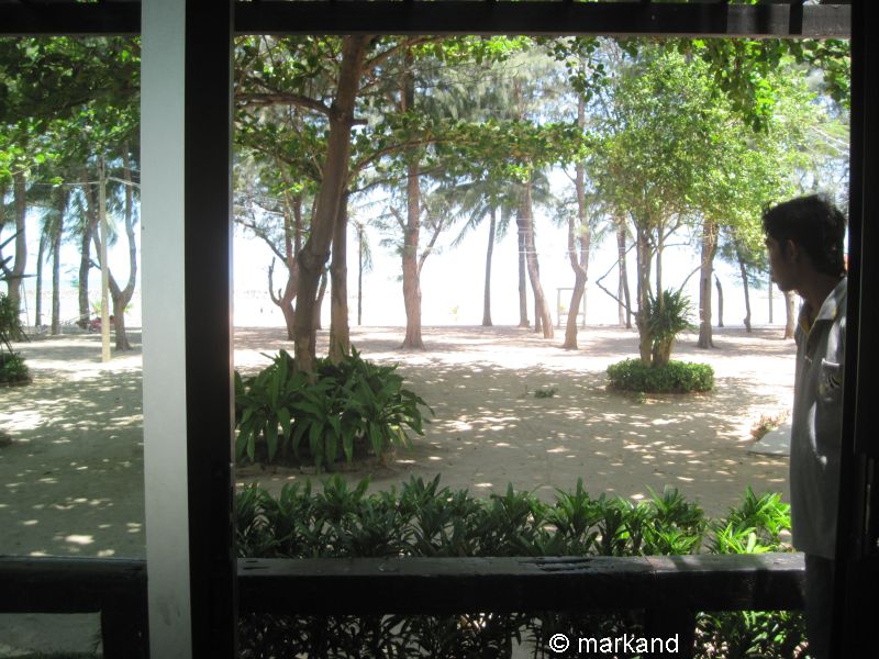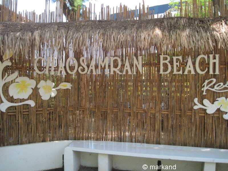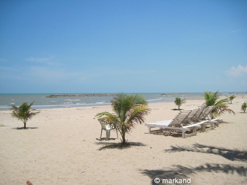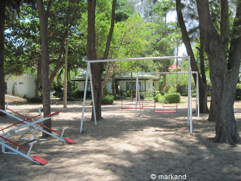 Vorne am Strandabschnitt schattenspendende Kasuarinen, darunter ein Kinderspielplatz und Liegen.