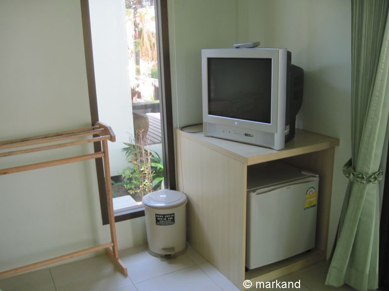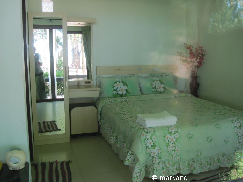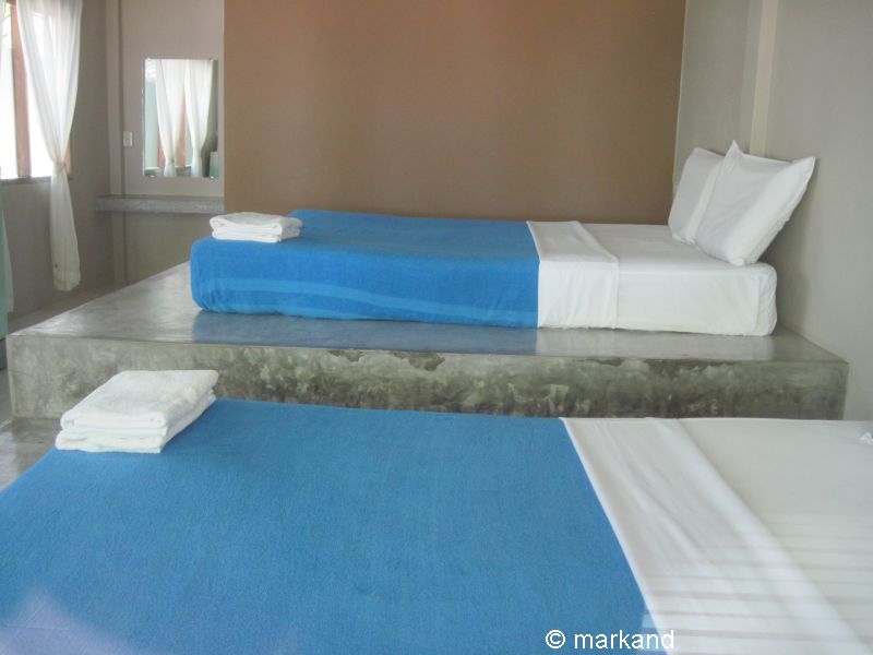 Zimmer in Reihenhäusern mit zwei großen Betten. Davor zwei Bungalows mit einem Doppelbett.