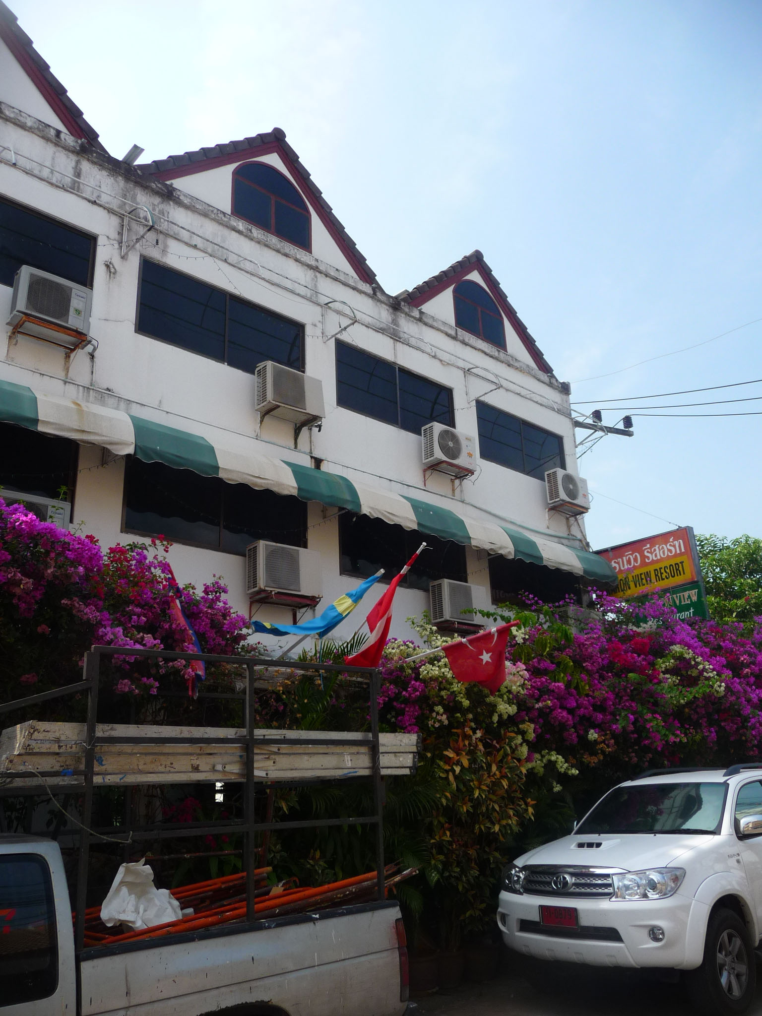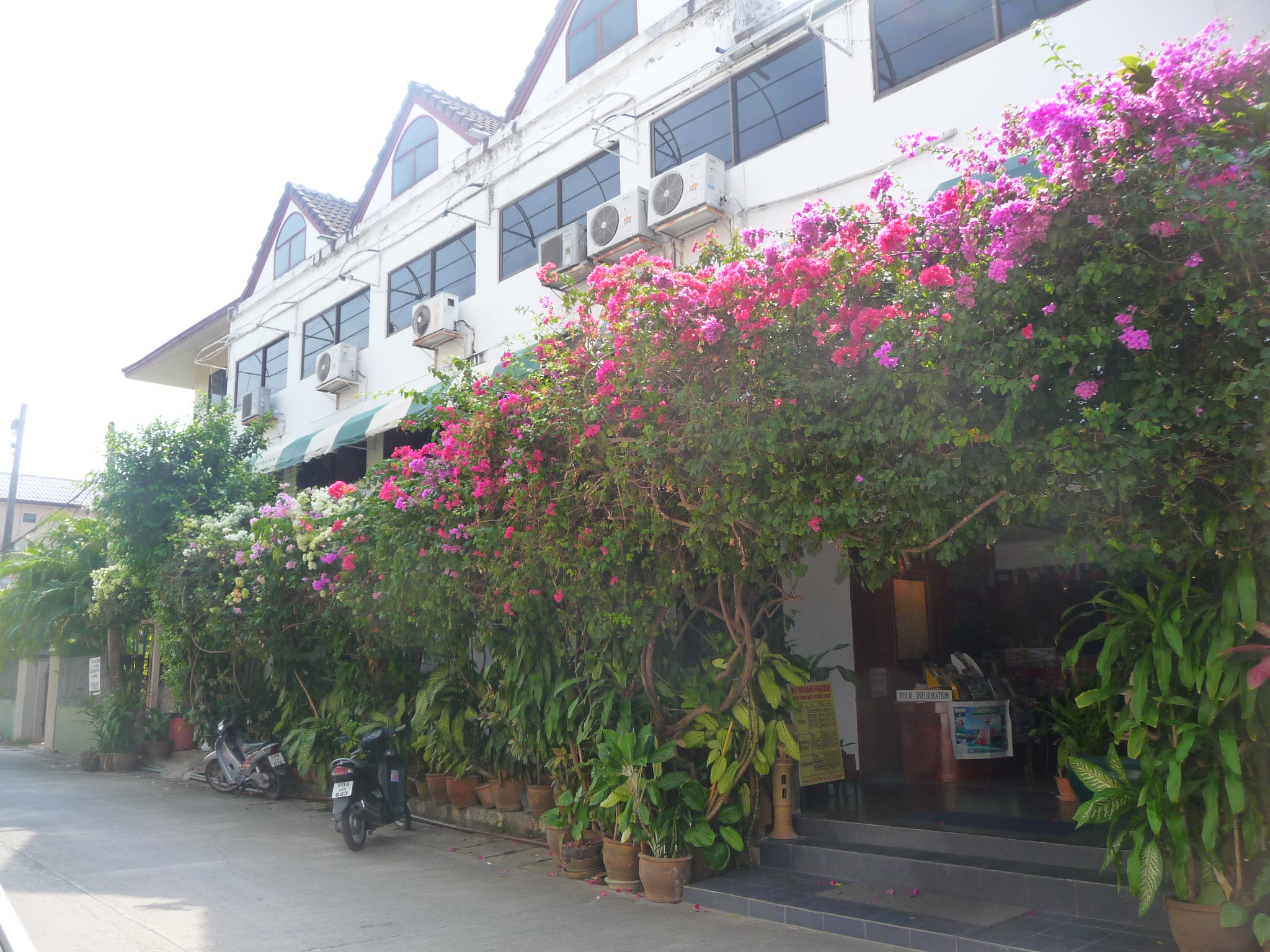 Hübsch sind die Bougainvillen-Sträucher an der Fassade.