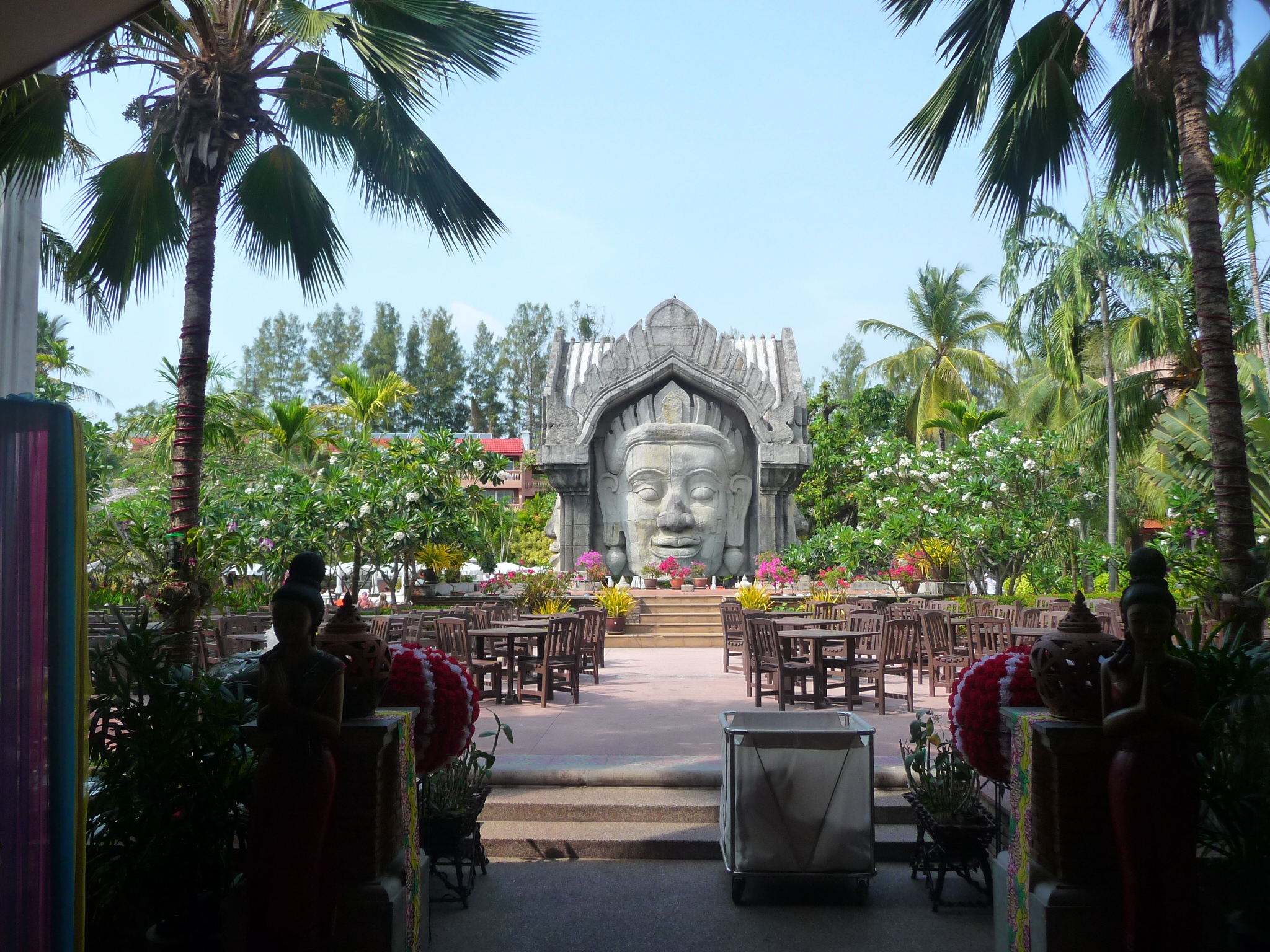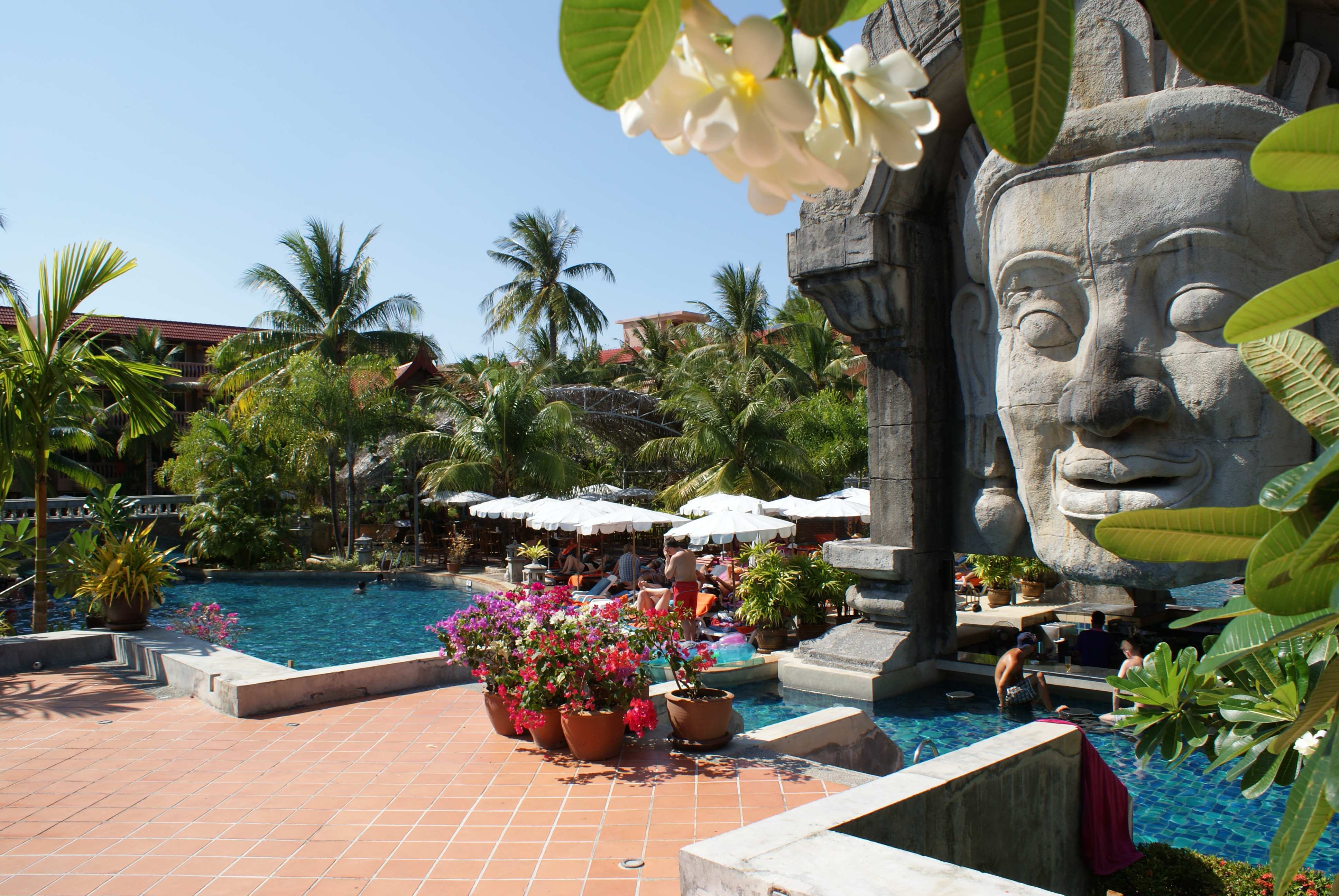 Freundlich gestaltete Zimmer befinden sich in 3stöckigen Gebäuden um den großen Hauptpool, über dem ein riesiger Buddha-Kopf aus Stein wacht.