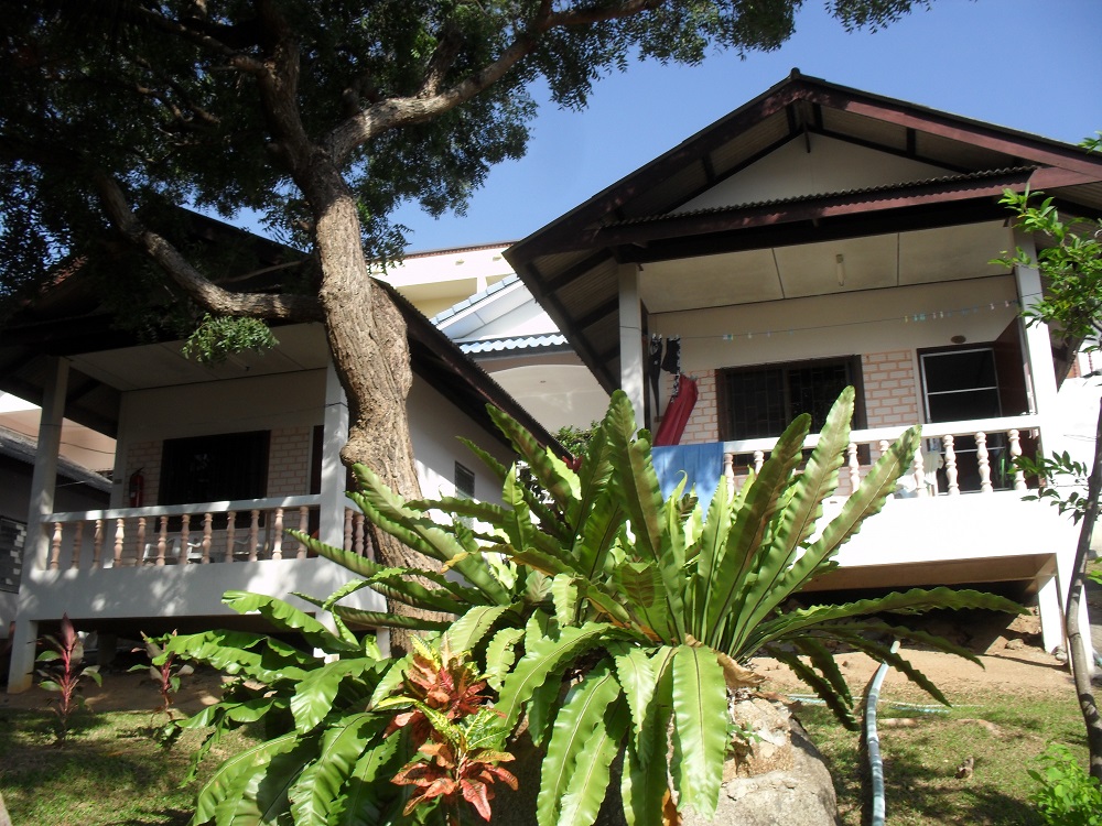 Auf einem Hügel im Hinterland stehen in einem weitläufigen Garten einfache Holz- und Steinbungalows (mit und ohne Bad) und ein zweistöckiges Haus mit schönen, sauberen AC-Zimmern dahinter.