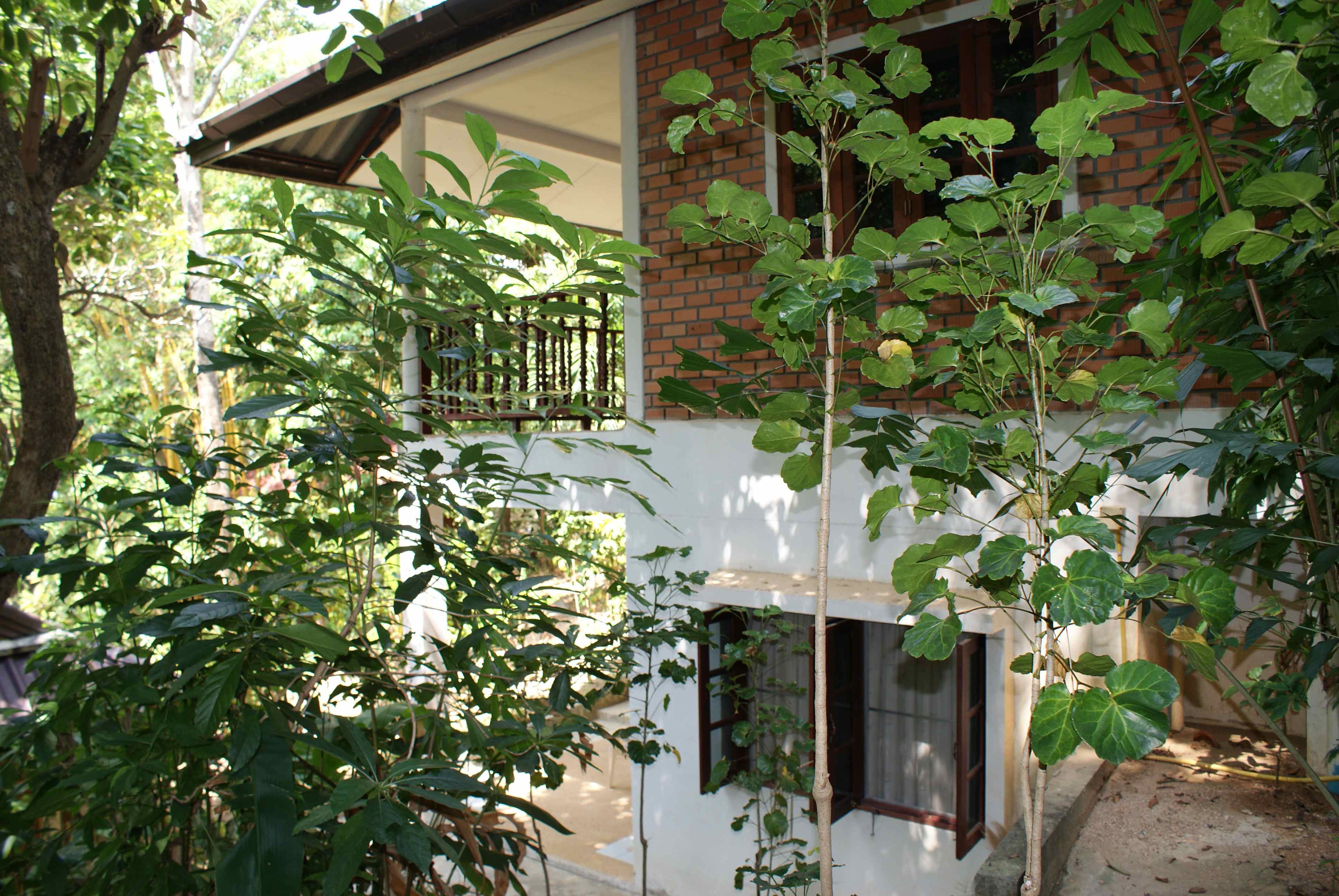 Einfache, großräumige Bungalows und Doppel-Häuser aus Stein stehen in einem wald-artigen Garten am Hügel über dem Aspasia.