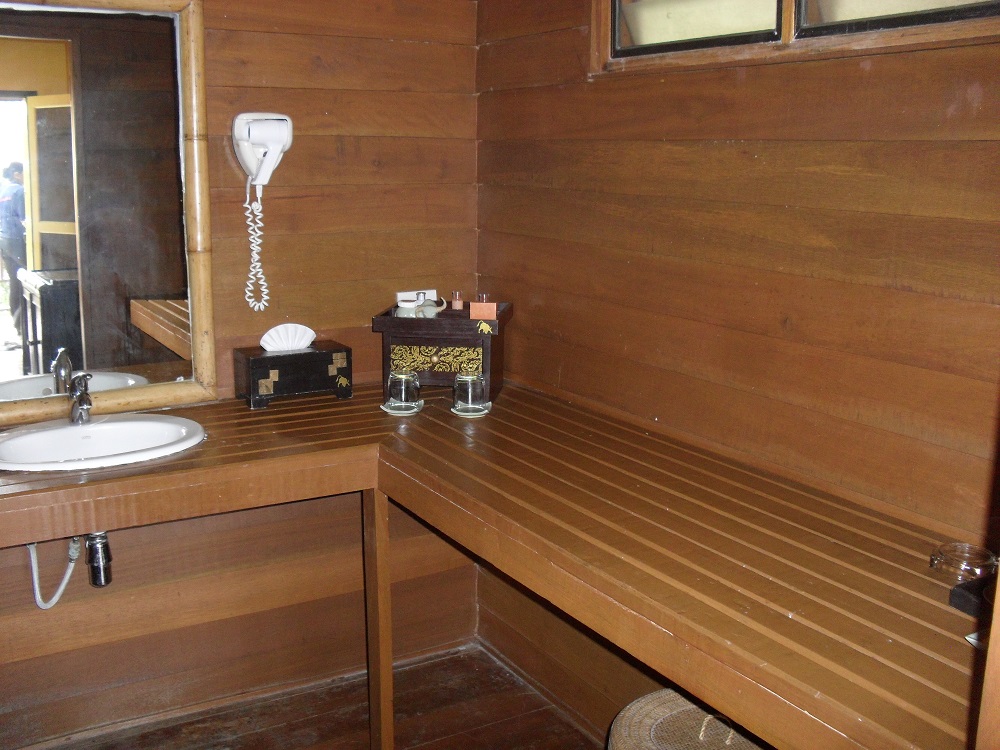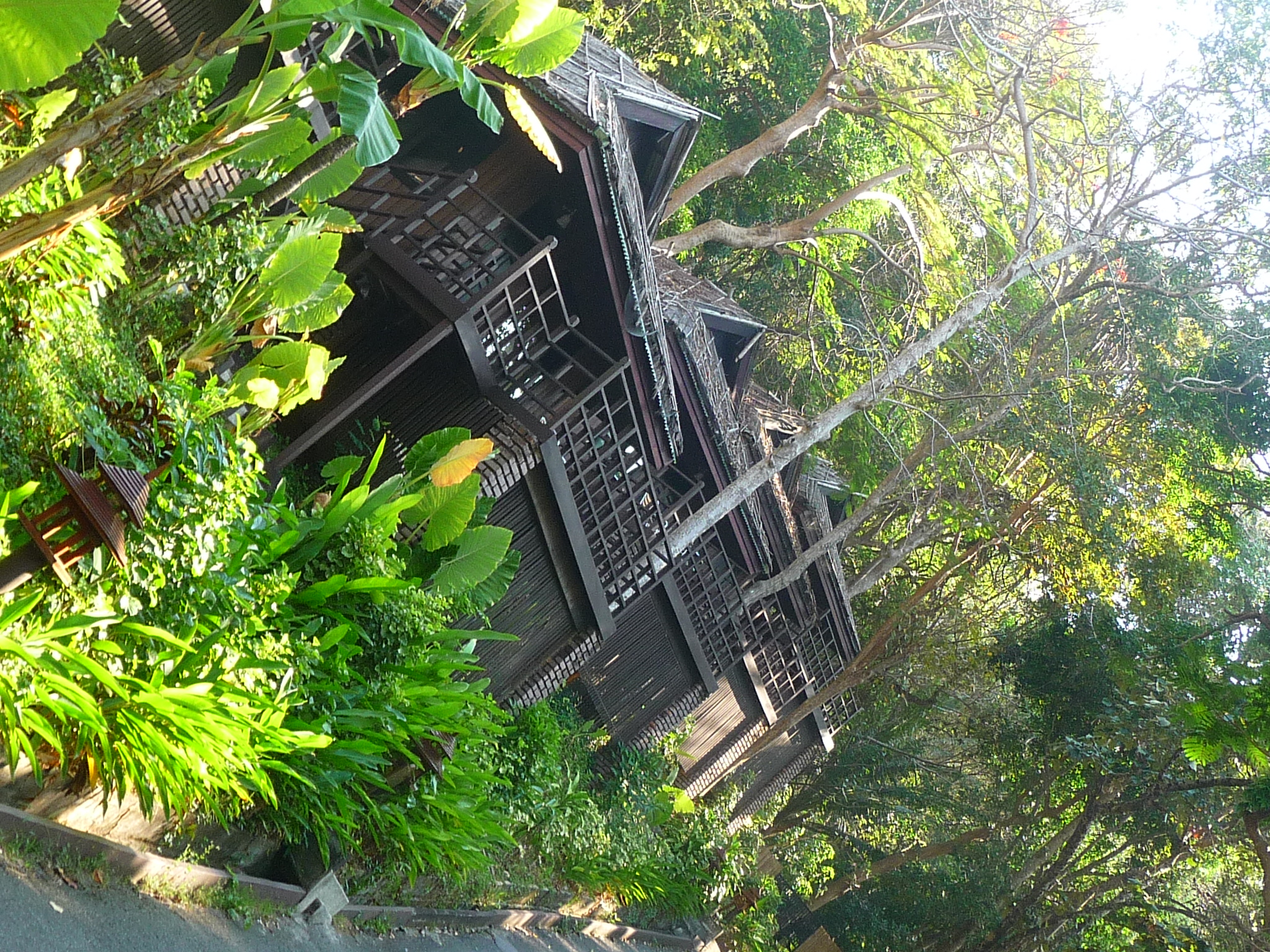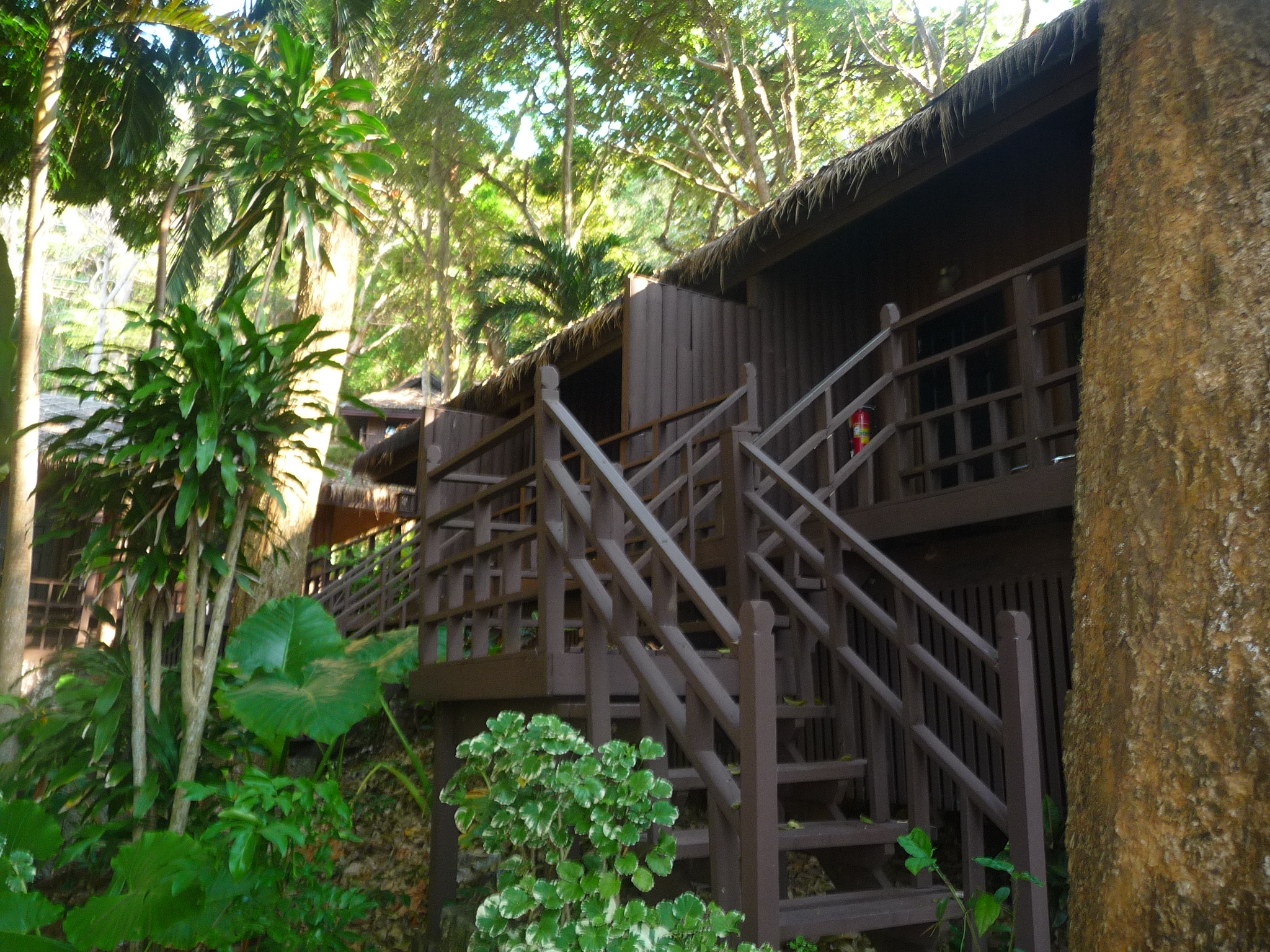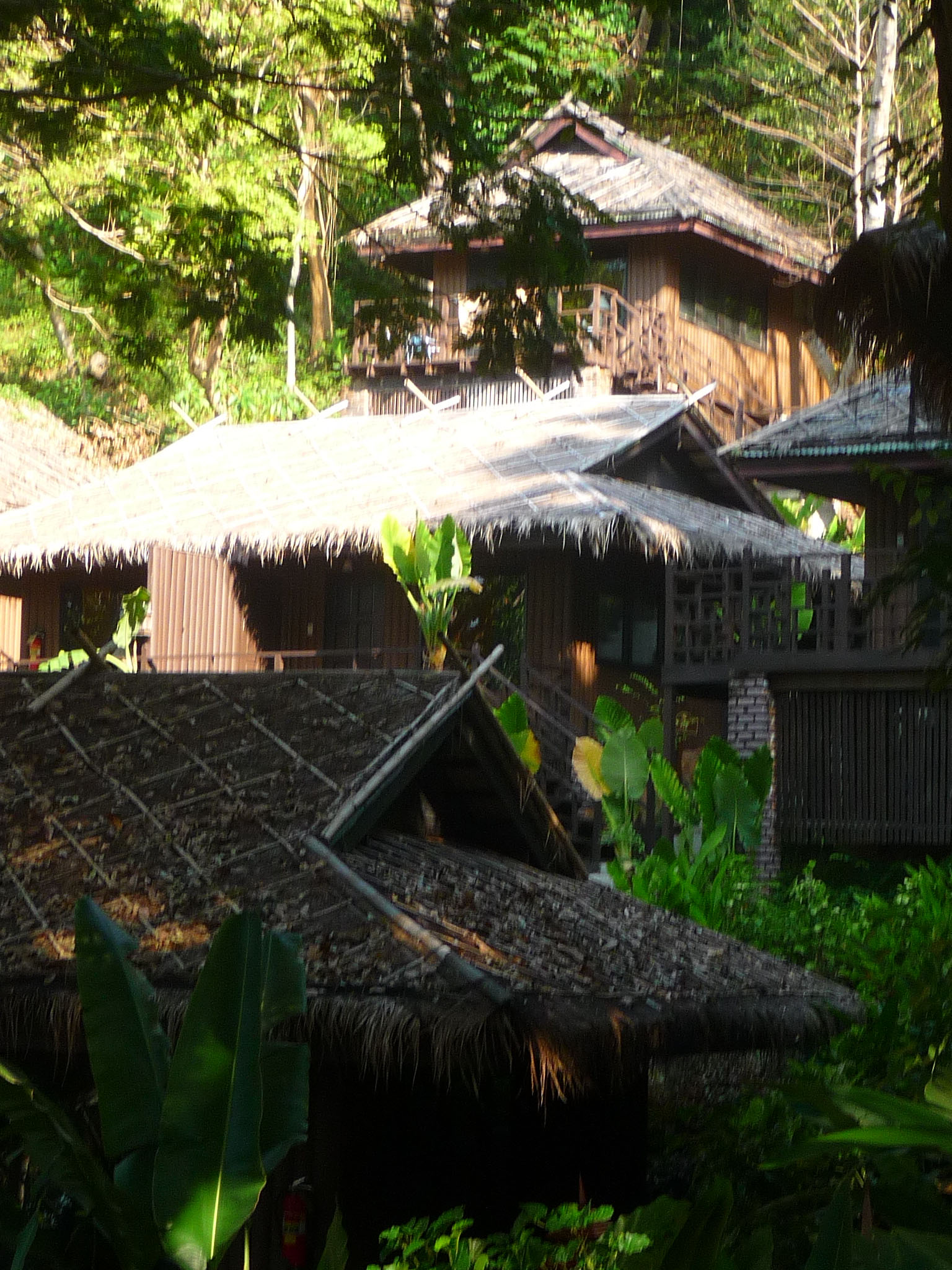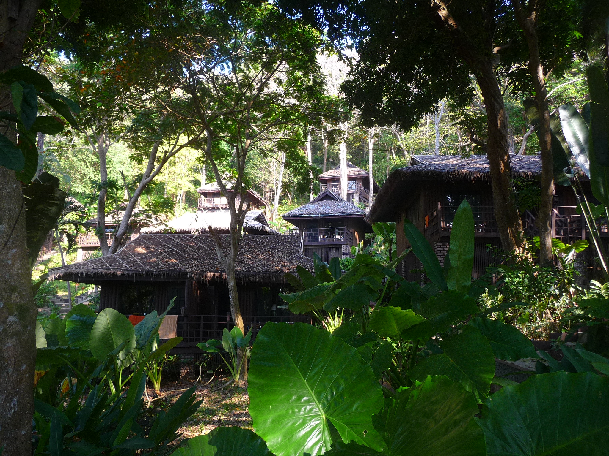 Wie im Dschungel gelegene Anlage: unter dichten Bäumen stehen dunkle Holzbungalows oder -zimmer im Hang.