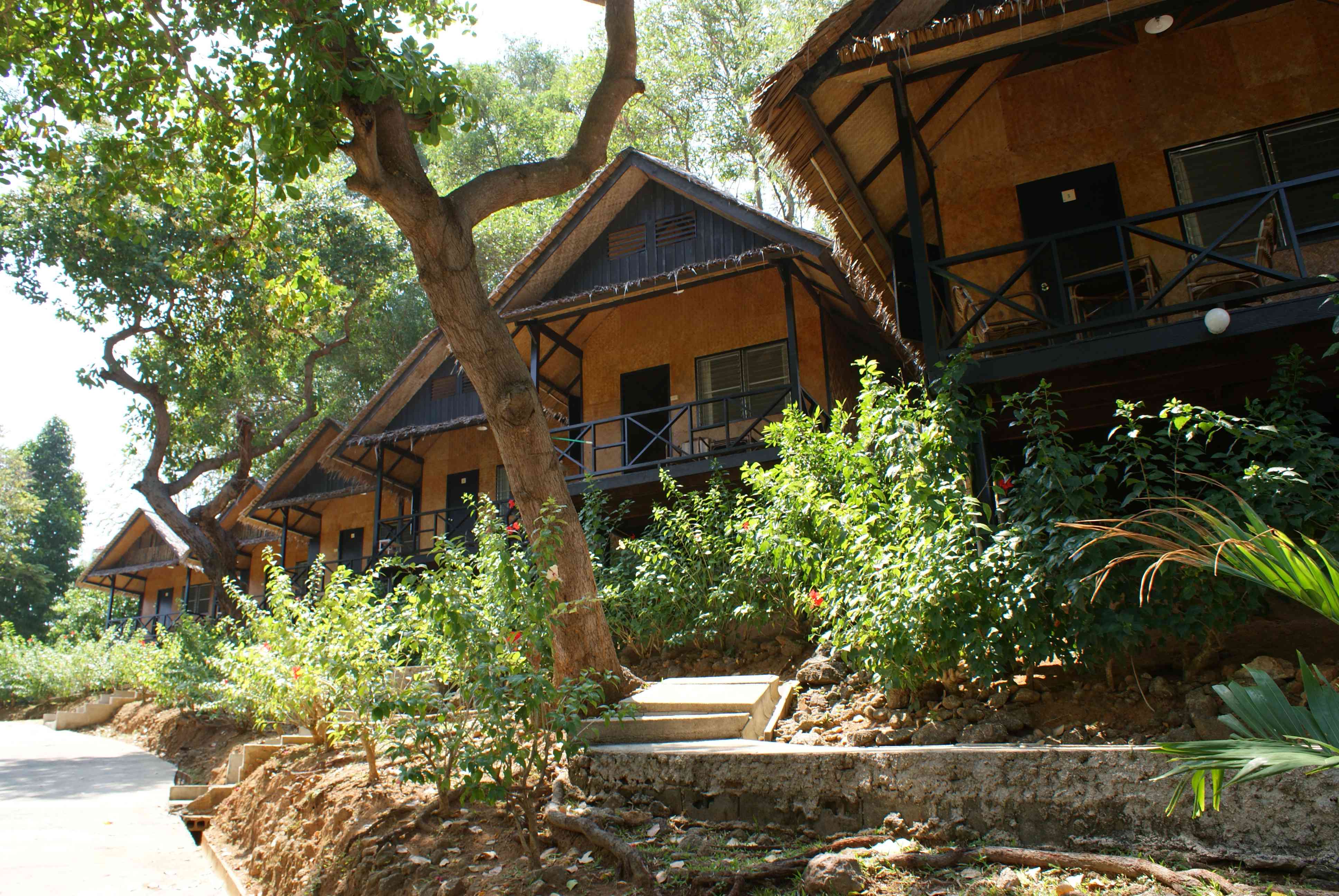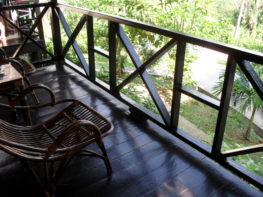 In einer ruhigen Anlage am Hügel, in der Nähe des View-Points, stehen schöne Bambusmatten-Bungalows mit Veranda unter schattenspendenden Bäumen.