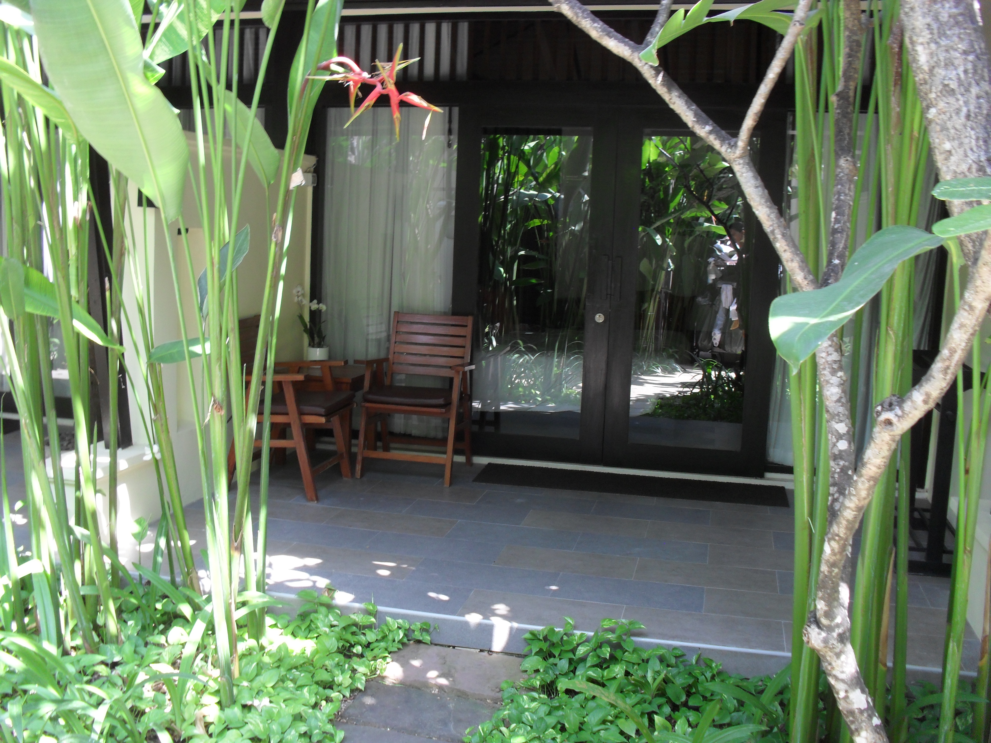 Elegante Zimmer mit dunklem Holz und dezenter Hintergrundbeleuchtung in ebenerdigen Reihenhäusern mit Terasse direkt am Strand.