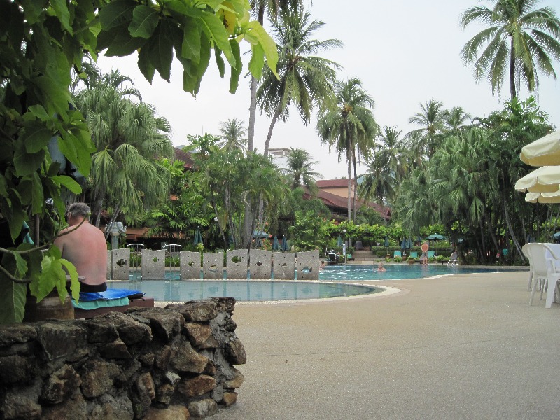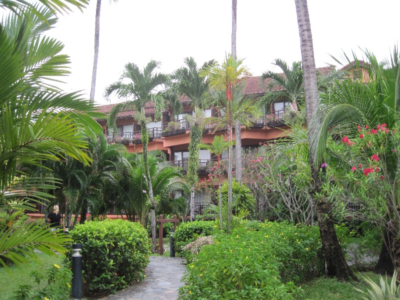 Großer Pool inmitten tropischen Grüns. Große Anlage mit 400 ansprechenden Zimmern.