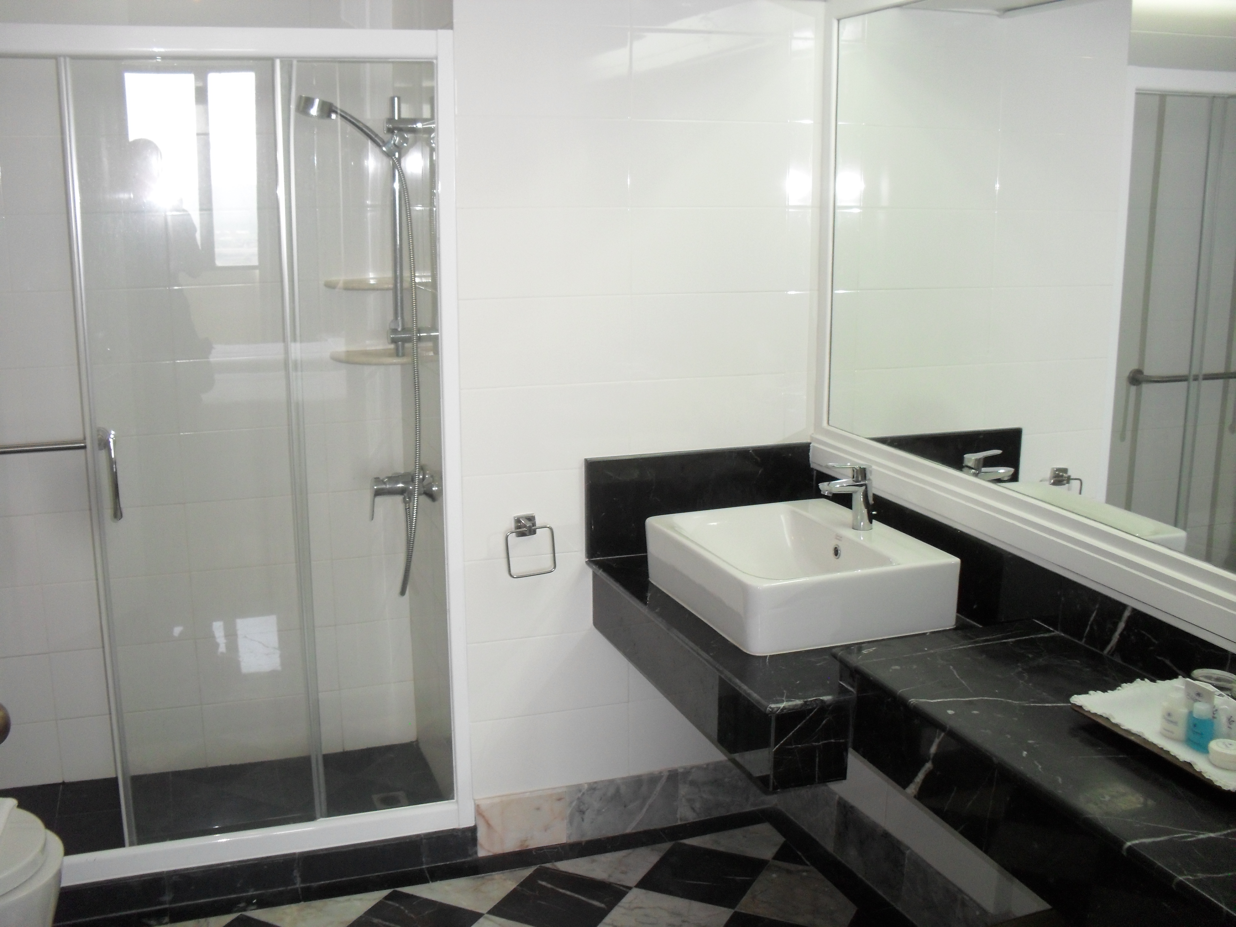 Gut ausgestattete Zimmer mit großen Bädern und toller Aussicht von den oberen Etagen.
