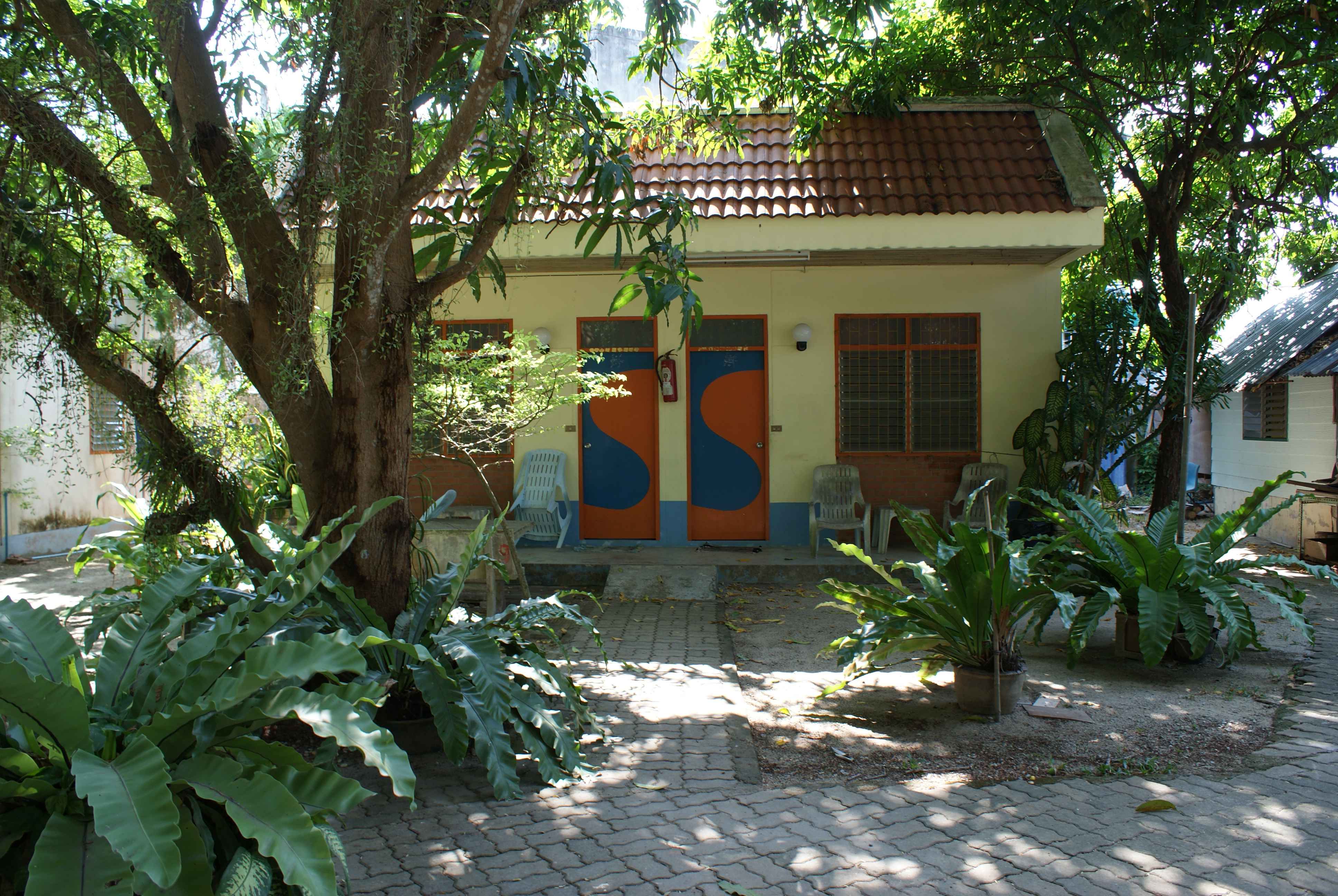 Einfache Doppelbungalows mit Kühlschrank und Thai-TV in einem ruhigen Hof mit einigen Bäumen.
