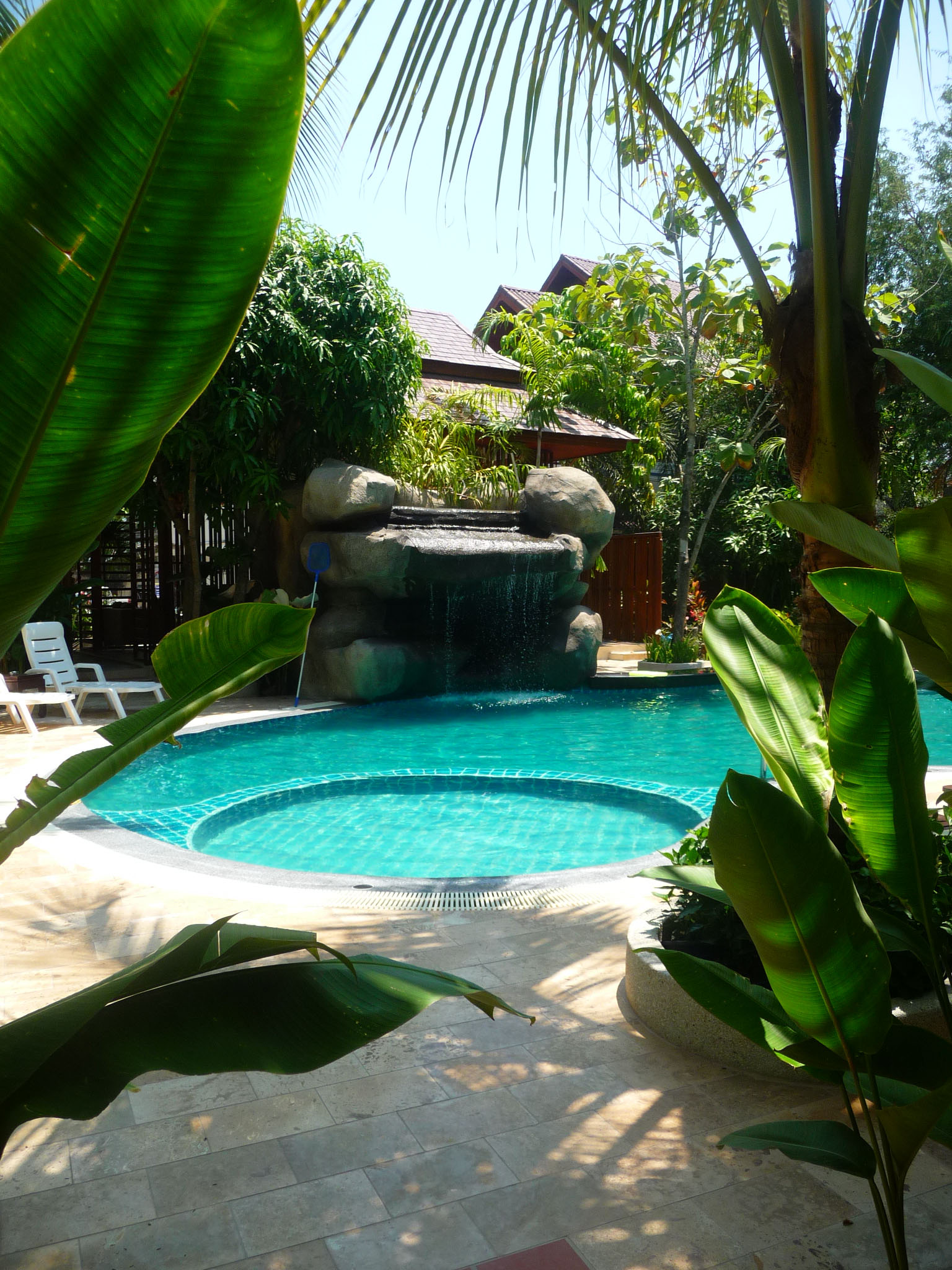 Renoviert und auf Resort getrimmt: Sehr kompakte Anlage mit kleinem Pool und Wasserfall in der Mitte.