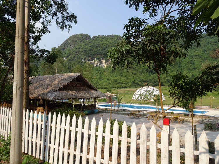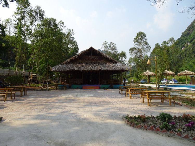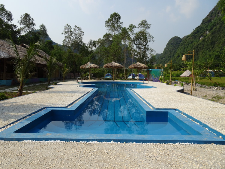 Camp im Inland ... großer Pool mit Partybühne, dahinter ein Partyzelt auf der Wiese.