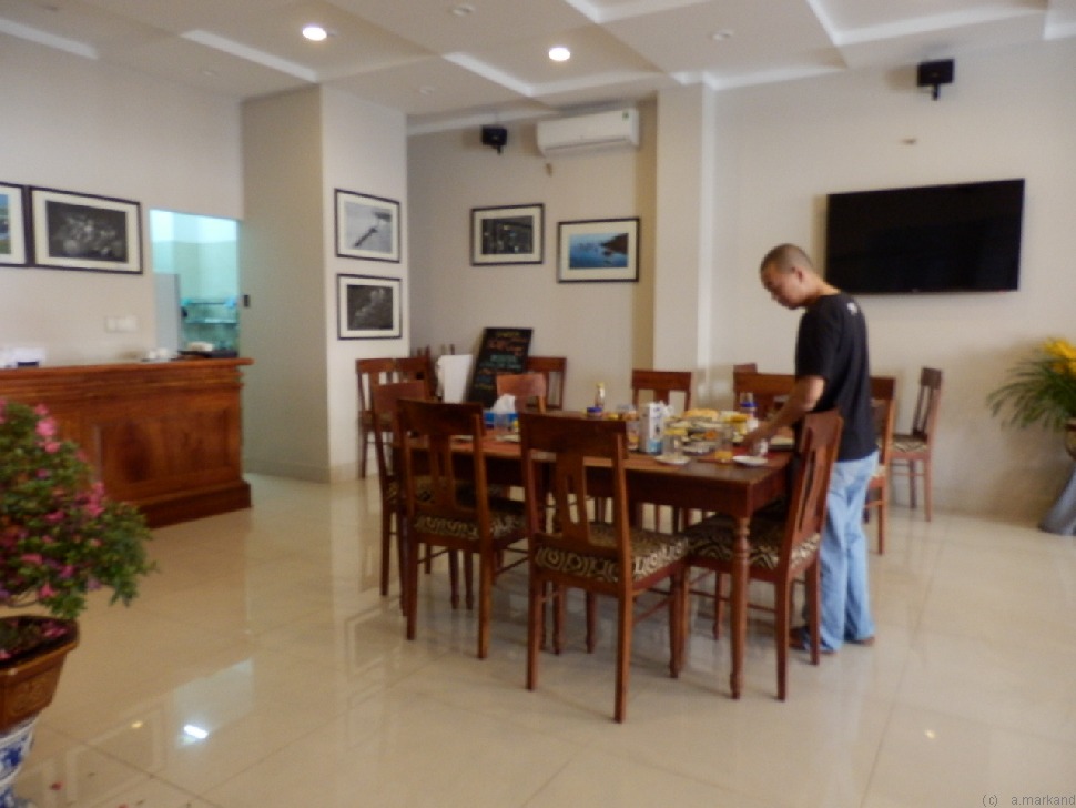 Großes Frühstück, welches wahlweise am großen Tisch oder auch an kleineren Tischen eingenommen werden kann.