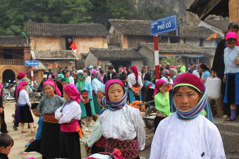 Sonntags treffen sich am Markt in Dong Van die Bewohner der benachbarten Dörfer; um Handel zu treiben, Freunde und Bekannte zu treffen, zu klönen und zu flirten ... ein buntes Stelldichein von Angehörigen verschiedener Volksgruppen, die z.T. in ihren aufwendigen traditionellen Trachten gekleidet sind.