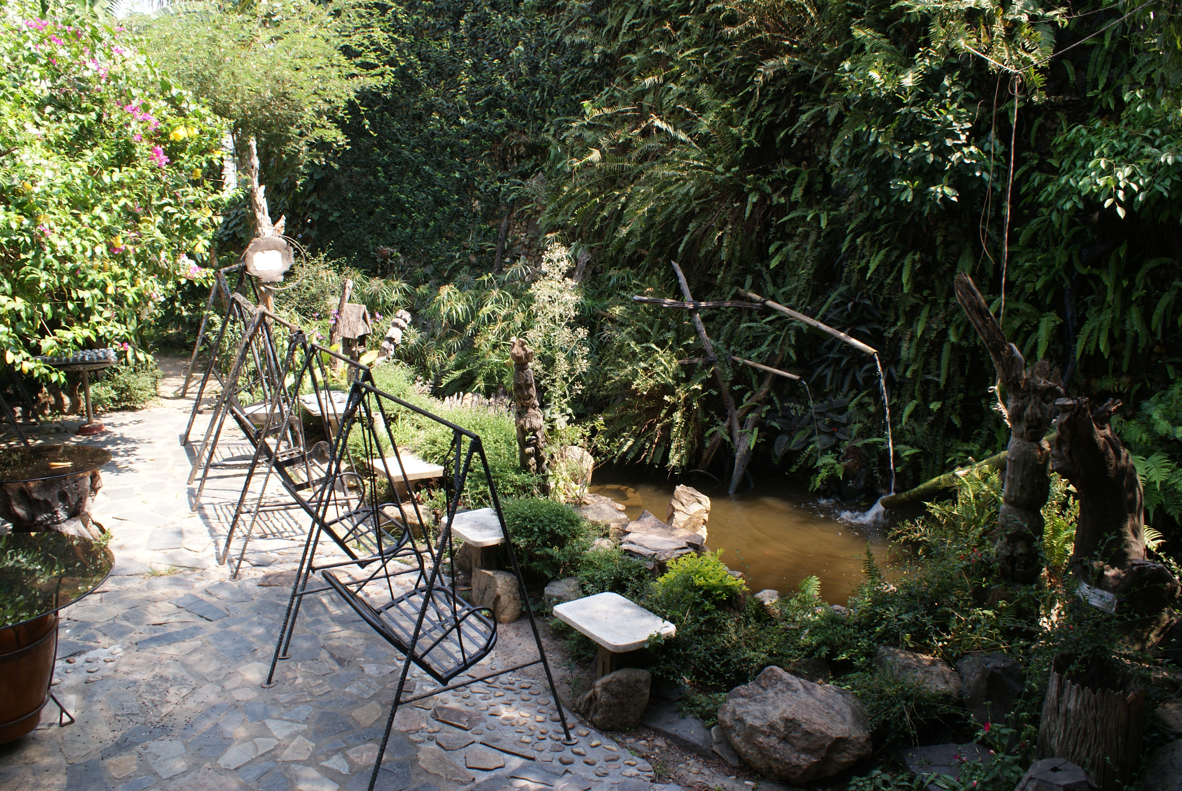 Kaffee, Shakes und Snacks werden hier in einem schön gestalteten Grundstück mit kleinem Wasserfall serviert.