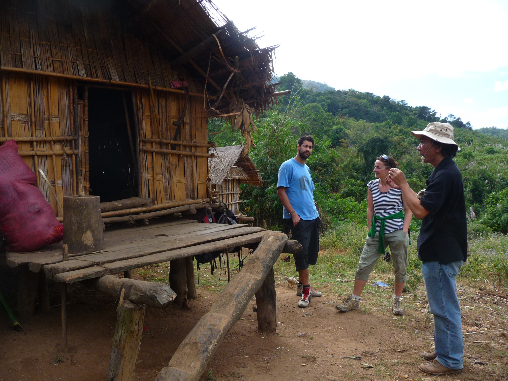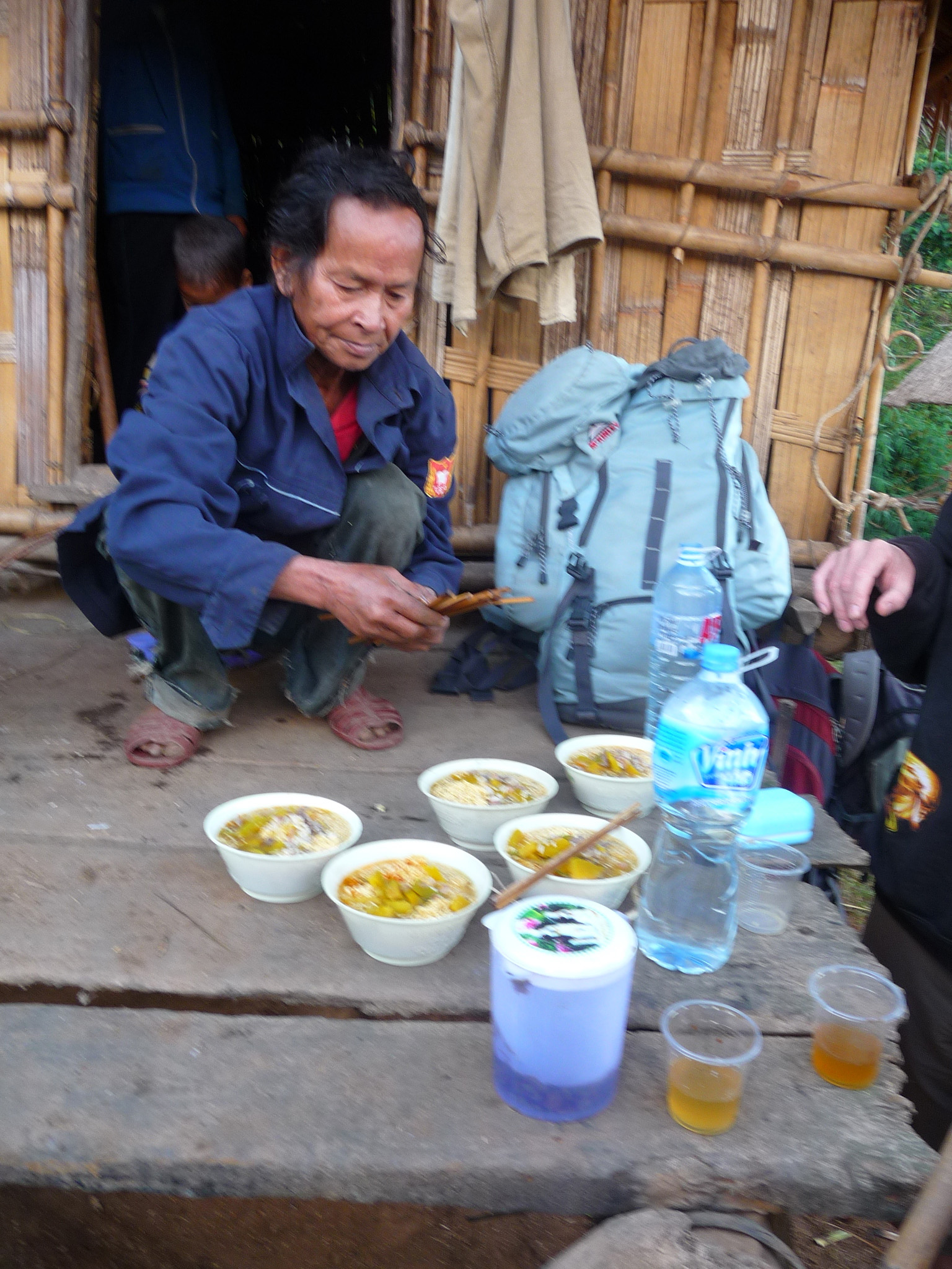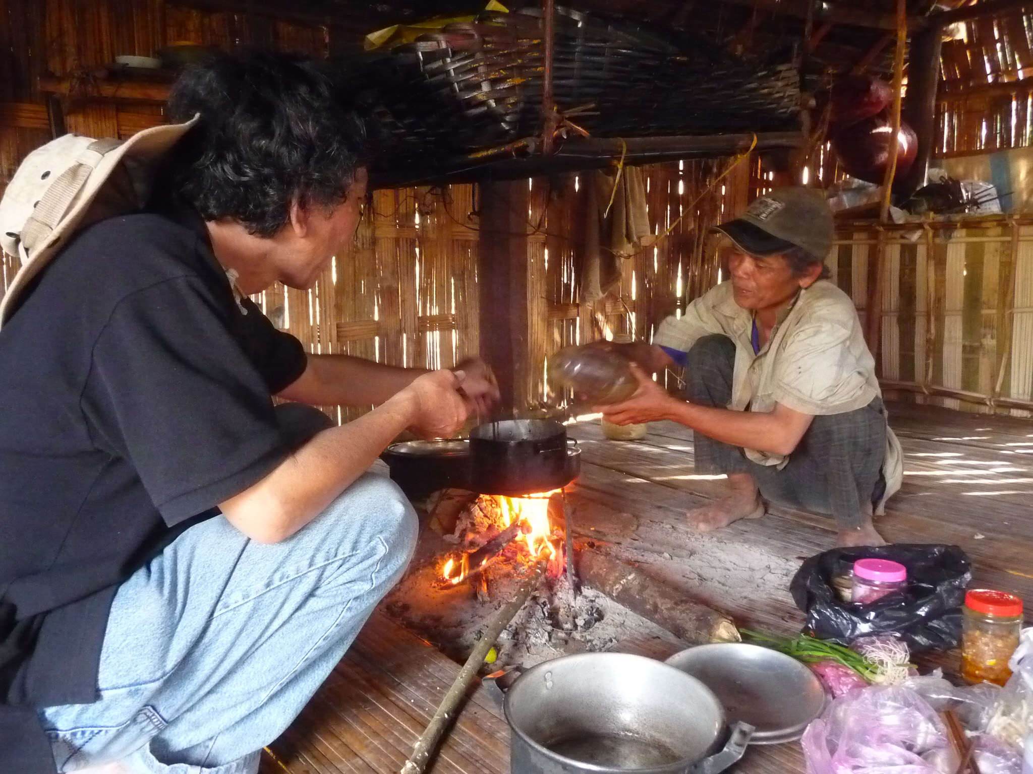 Nach 2 Stunden sind wir in unserem neuen Zuhause: eine Familie nimmt uns auf. Eine große Hütte, eine etwas kleinere für den Sohn samt Familie, eine noch kleinere für den Reis. Alle Hütten stehen auf Stelzen, sind aus Bambus und ohne einen einzigen Nagel zu verwenden gemacht. Es gibt eine Feuerstelle in der Mitte des Raums. Schweine, Hühner, Ziegen und Hunde laufen draußen um uns herum. Die Kuh wird gegen Dämmerung gesucht und angebunden. Wir gehen mit Som, dem Familienoberhaupt zurück in den Dschungel: suchen – besser er sucht – schmackhafte Blätter fürs Abendbrot und schlägt den richtigen Bambus, um später Sticky Reis zu machen. Bevor die Sonne untergeht, gibt es noch eine schnelle Wäsche im nahe gelegenen Bachlauf.