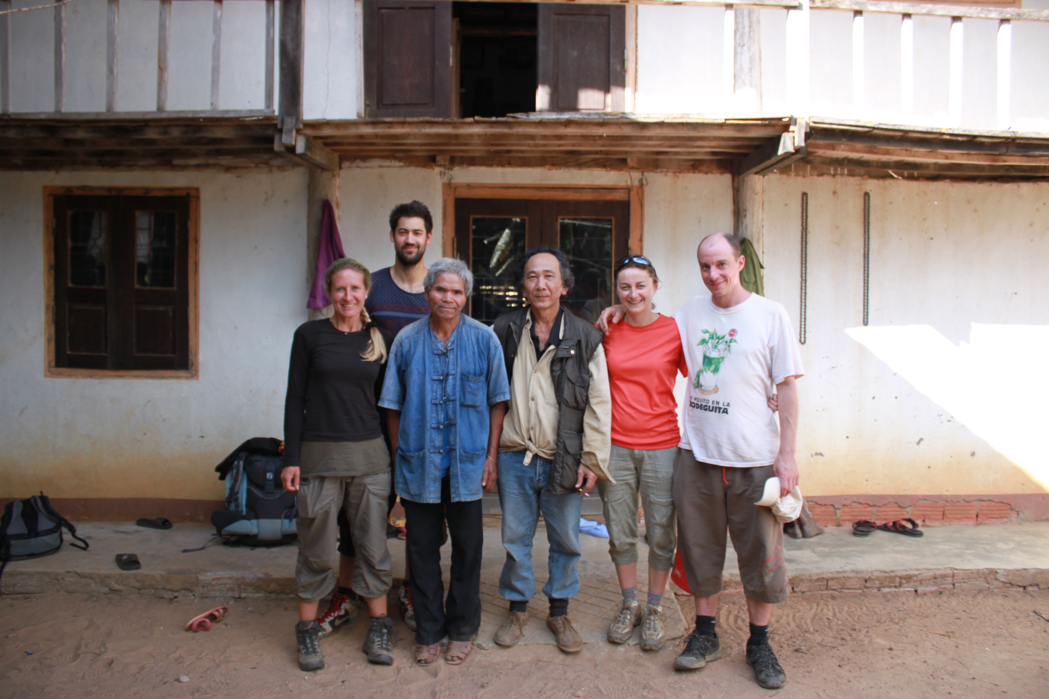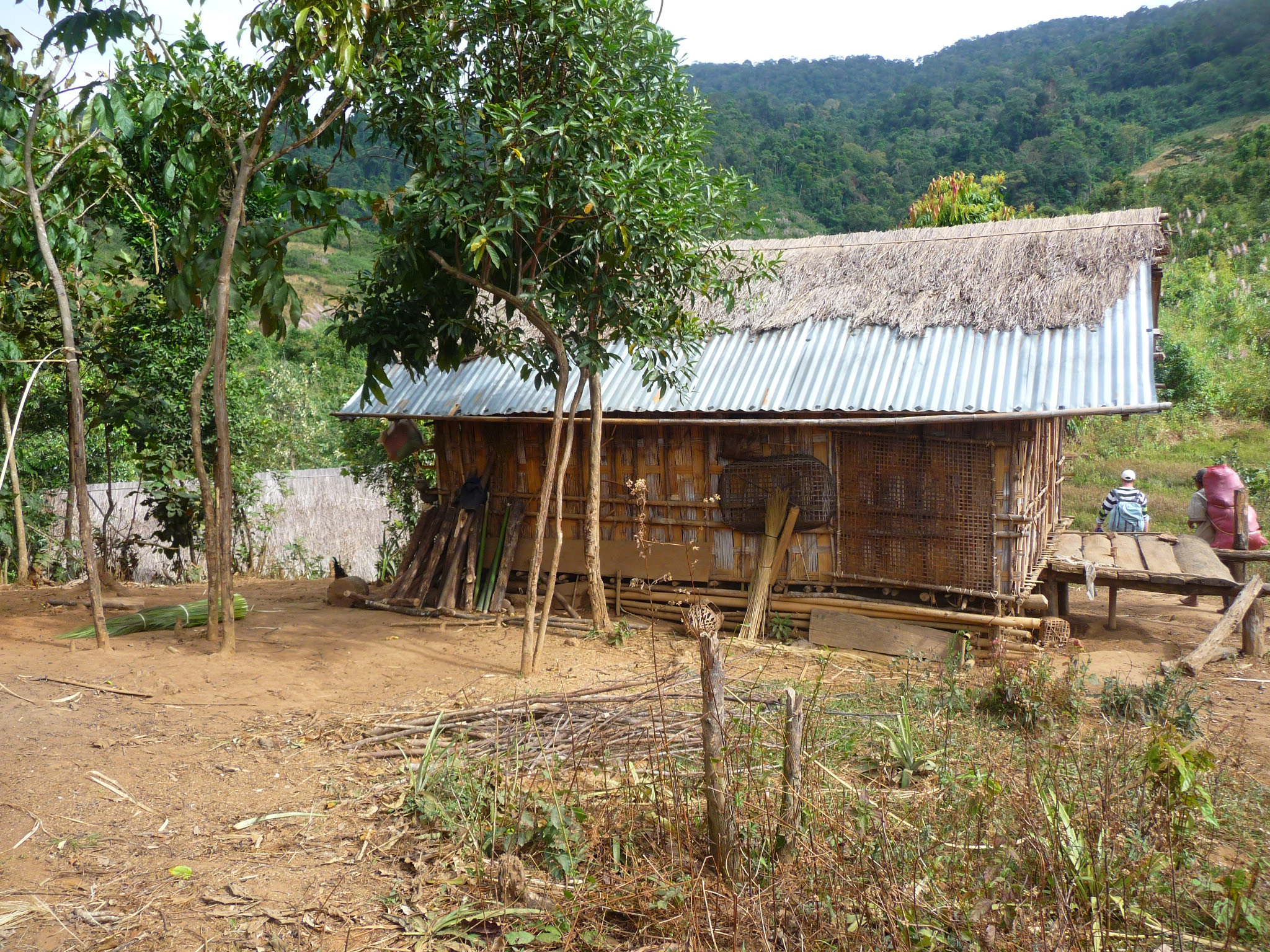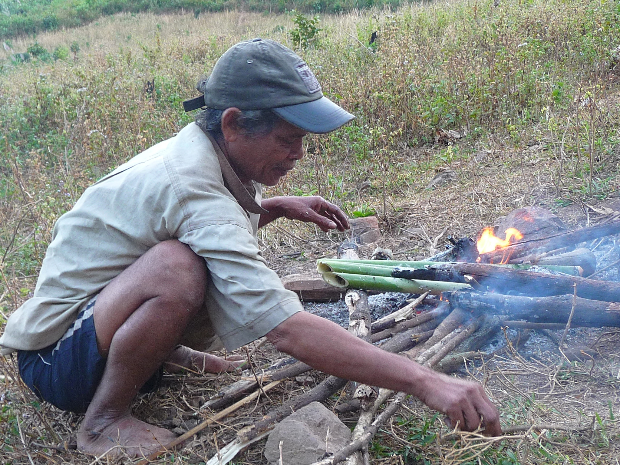 Nach 2 Stunden sind wir in unserem neuen Zuhause: eine Familie nimmt uns auf. Eine große Hütte, eine etwas kleinere für den Sohn samt Familie, eine noch kleinere für den Reis. Alle Hütten stehen auf Stelzen, sind aus Bambus und ohne einen einzigen Nagel zu verwenden gemacht. Es gibt eine Feuerstelle in der Mitte des Raums. Schweine, Hühner, Ziegen und Hunde laufen draußen um uns herum. Die Kuh wird gegen Dämmerung gesucht und angebunden. Wir gehen mit Som, dem Familienoberhaupt zurück in den Dschungel: suchen – besser er sucht – schmackhafte Blätter fürs Abendbrot und schlägt den richtigen Bambus, um später Sticky Reis zu machen. Bevor die Sonne untergeht, gibt es noch eine schnelle Wäsche im nahe gelegenen Bachlauf.