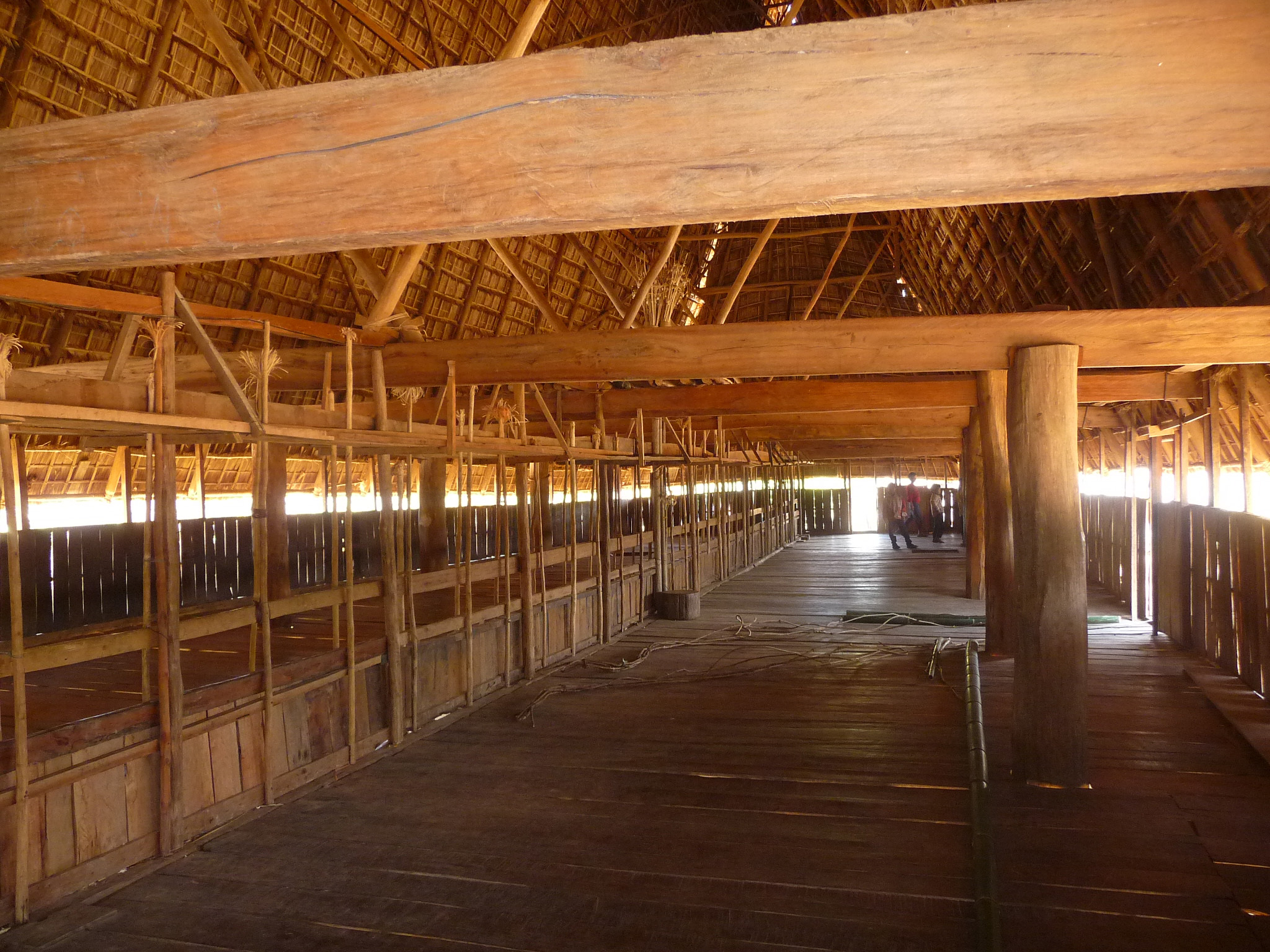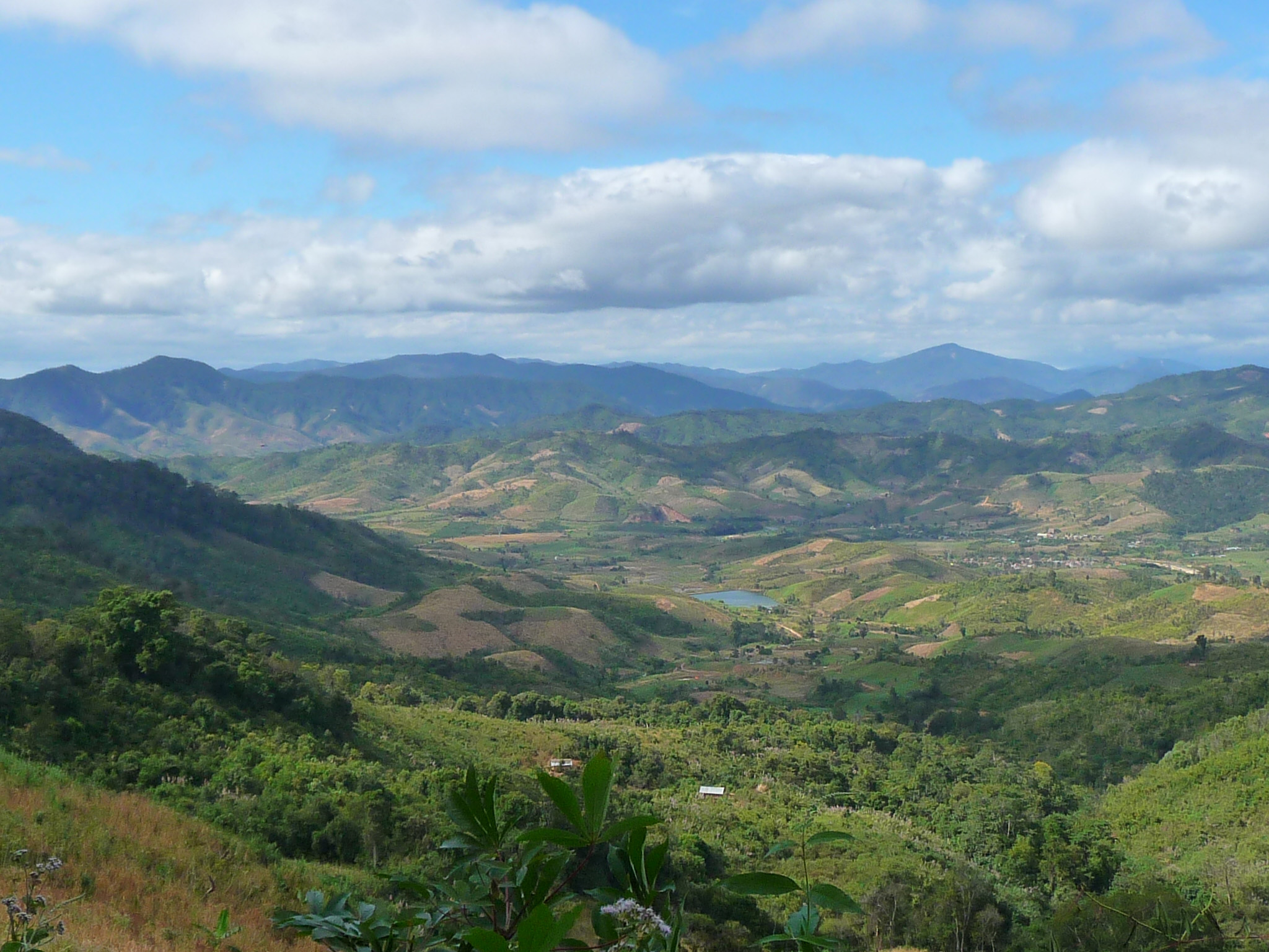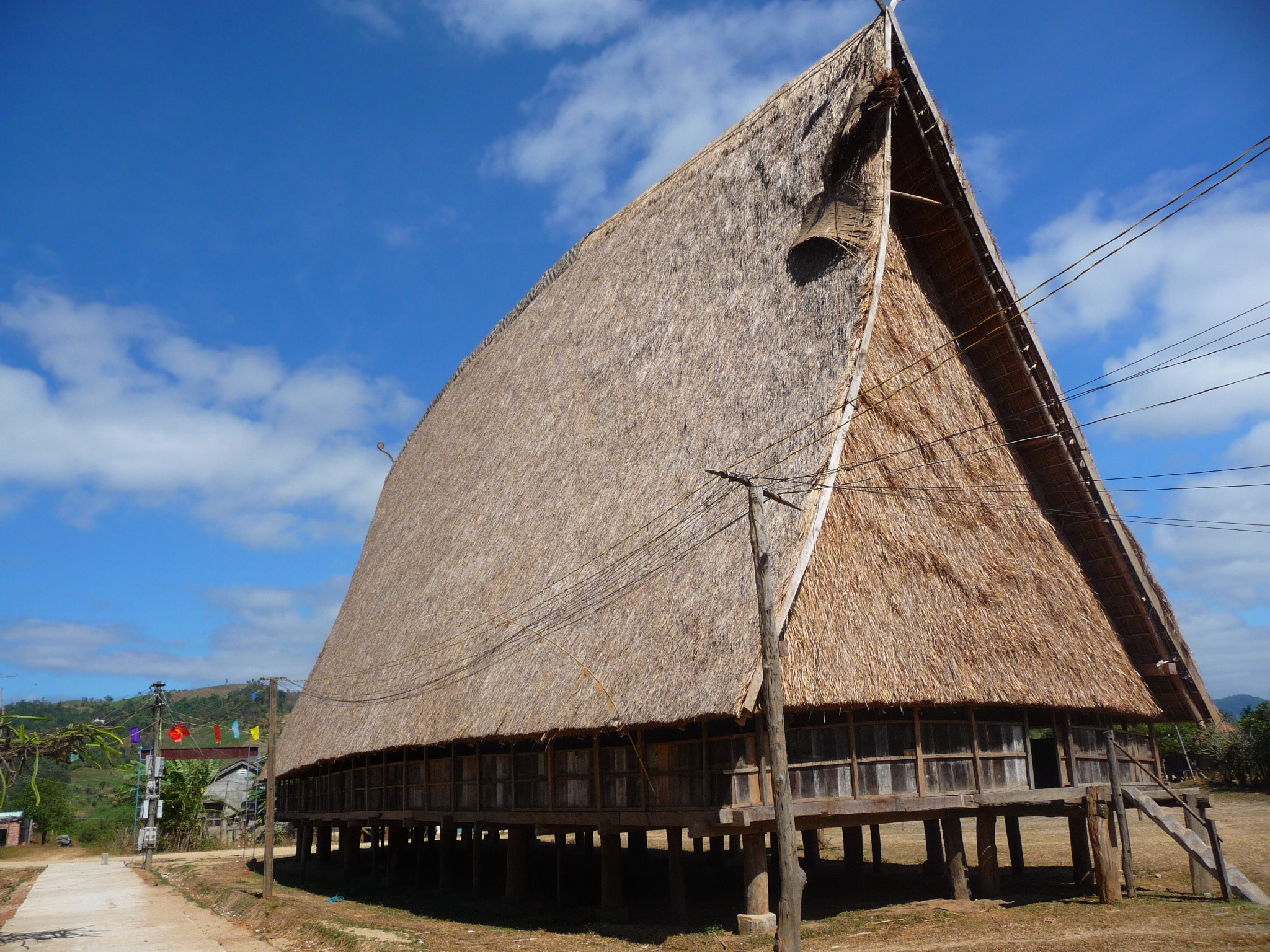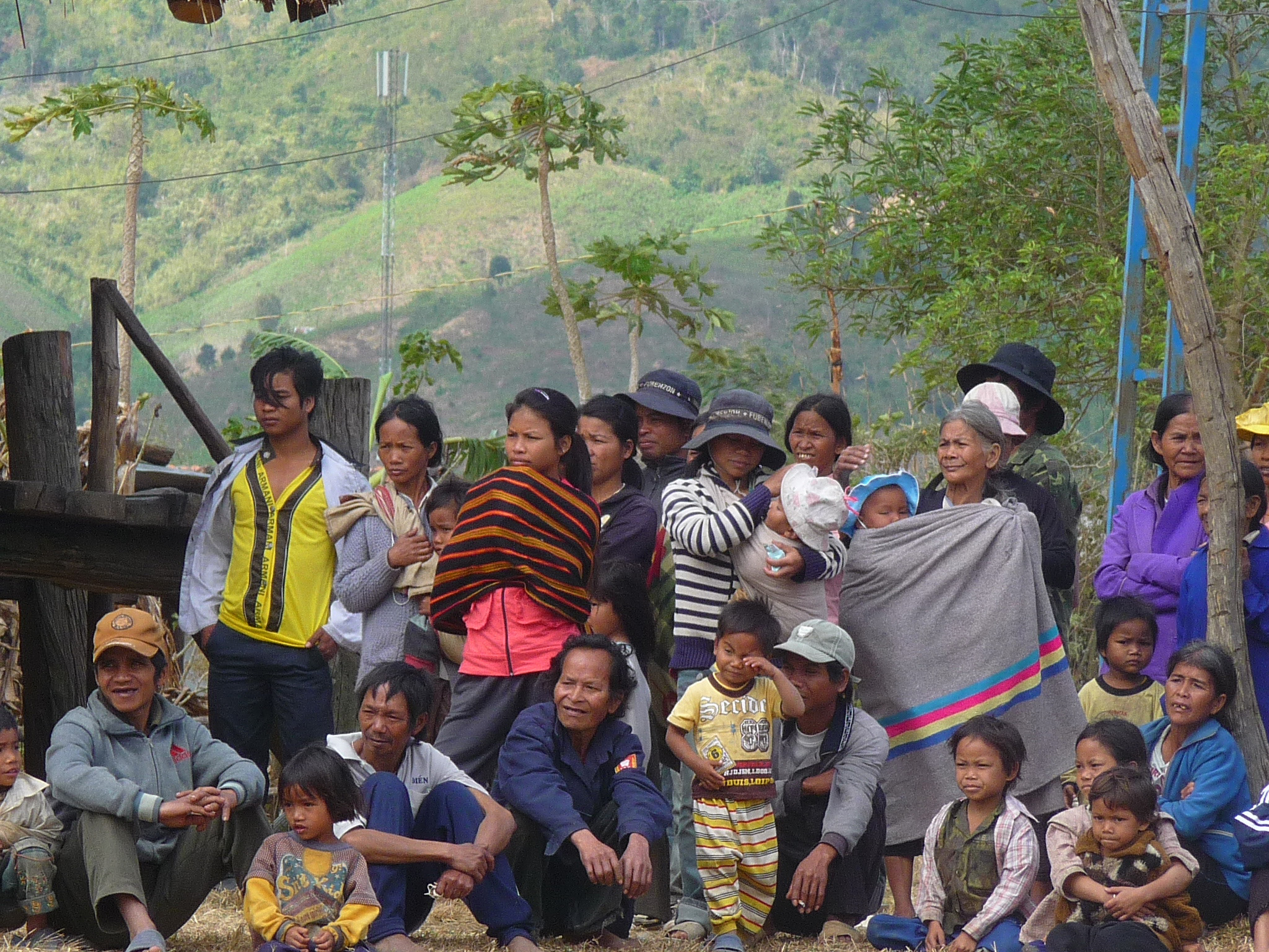 Wir wandern 2 Stunden die Berge hinauf zu einem der 3 verschieden Bahnar-Volksgruppen: Bahnar Jolang (die Bahnar, die in den Bergen leben). Sie „essen den Dschungel“: das heißt sie betreiben Wanderfeldbau. Sie bewirtschaften die mittels Brandrodung dem Dschungel abgetrotzte Fläche etwa 3-5 Jahre, bevor sie die Hütten abbrennen und an einen neuen Ort ziehen. Die Bahnar bauen Feldfrüchte an wie Maniok, Reis, Erdnüsse und Gemüse; sie betreiben Viehzucht, halten Schweine, Ziegen, Hühner oder auch eine Kuh. Die intensiv genutzten Flächen sind nach maximal 5 Jahren ausgelaugt, neuer Platz wird gesucht, der alte vom Dschungel überdeckt. Die Berghänge zeigen das im unterschiedlichen Bewuchs: den Zeitpunkt der Beschlagnahme.