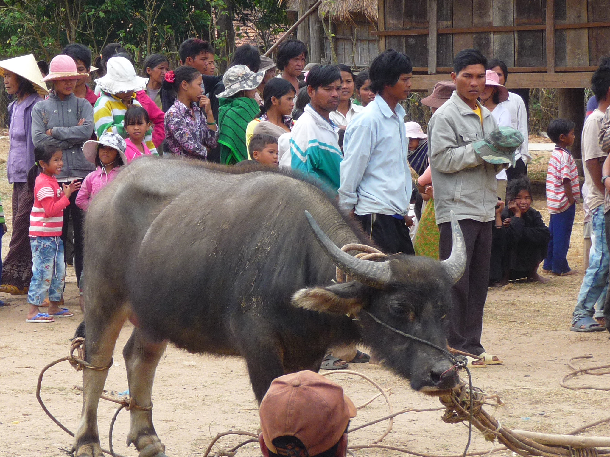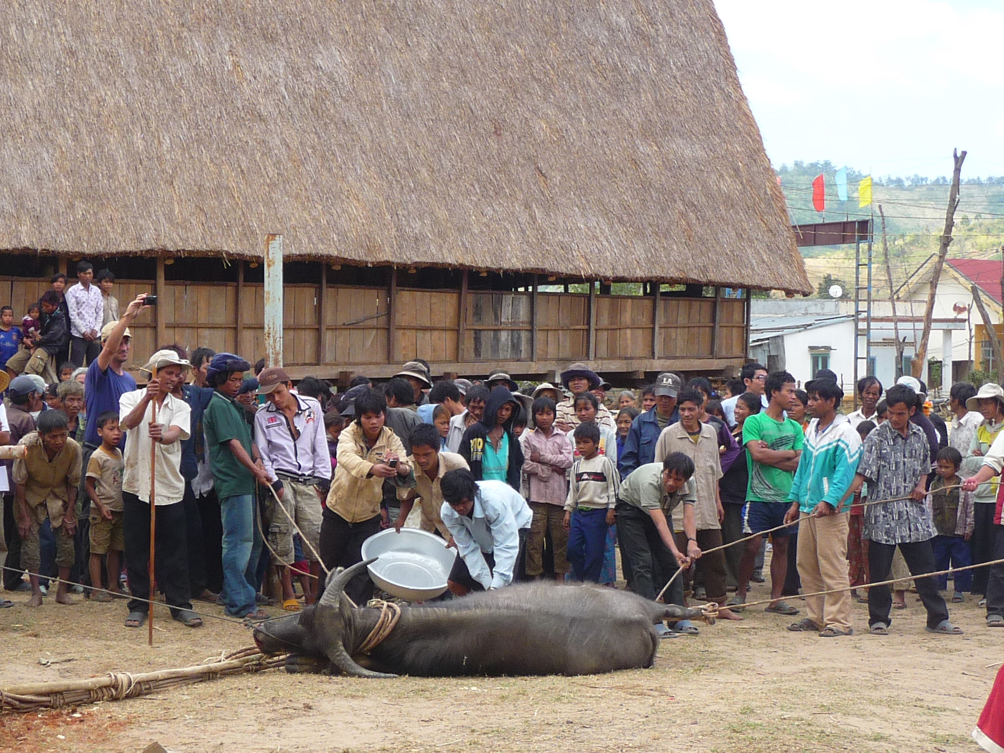 Dann wird der Büffel gebracht: alle haben zusammengelegt, um das Tier zu kaufen. Die Szenen sind nicht jedermanns Sache: das Tier spürt, dass etwas passiert, sträubt sich auf den Marktplatz gezogen zu werden. An die Stange gebunden mit gefesselten Hufen wird das Tier dreimal um die Stange gezogen oder besser gezerrt. Gongmusiker und Tänzerinnen in traditionellen Kleidern (zweiteiliger schwarzer Stoff mit bunten Applikationen) umrunden den Platz. Dann wird die Lanze angesetzt und der Büffel mit vielen Stichen geschlachtet, das Blut aufgefangen. Alle Familien tunken einen Finger in das Blut und malen ein Zeichen auf Stirn oder Wange. Es symbolisiert den Zusammenhalt und das Überleben aller Familien.