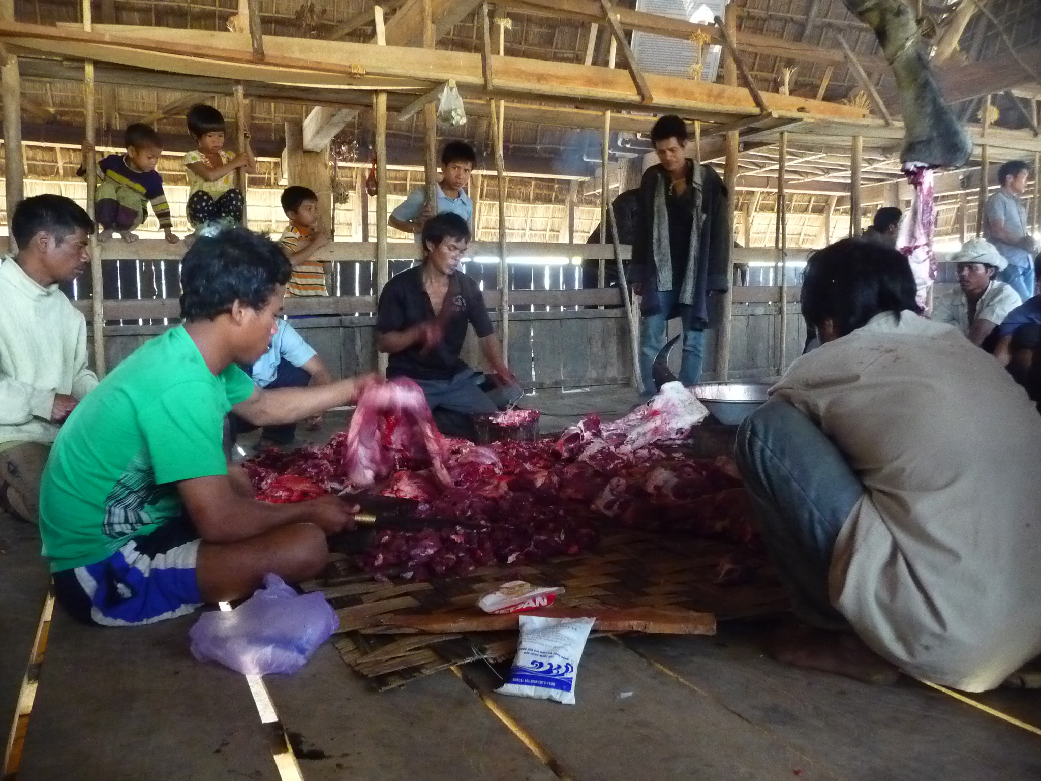 Der Büffel wird dann innerhalb der nächsten Stunden im Rong-Haus von mehreren Männern zerlegt. Das Fleisch entweder direkt im Rong Haus gegrillt, oder die Familien nehmen es mit nach Hause, um es dort zuzubereiten.