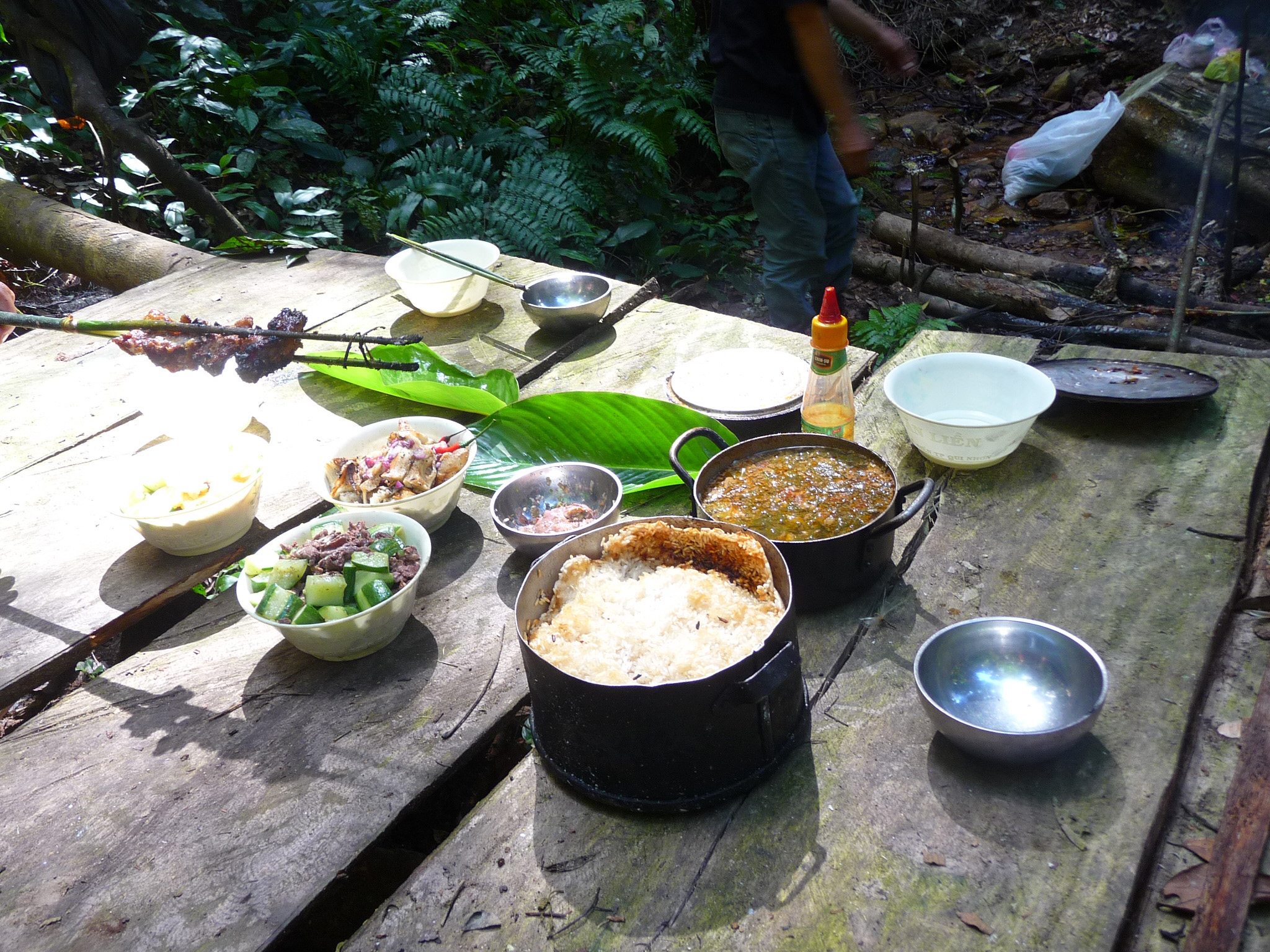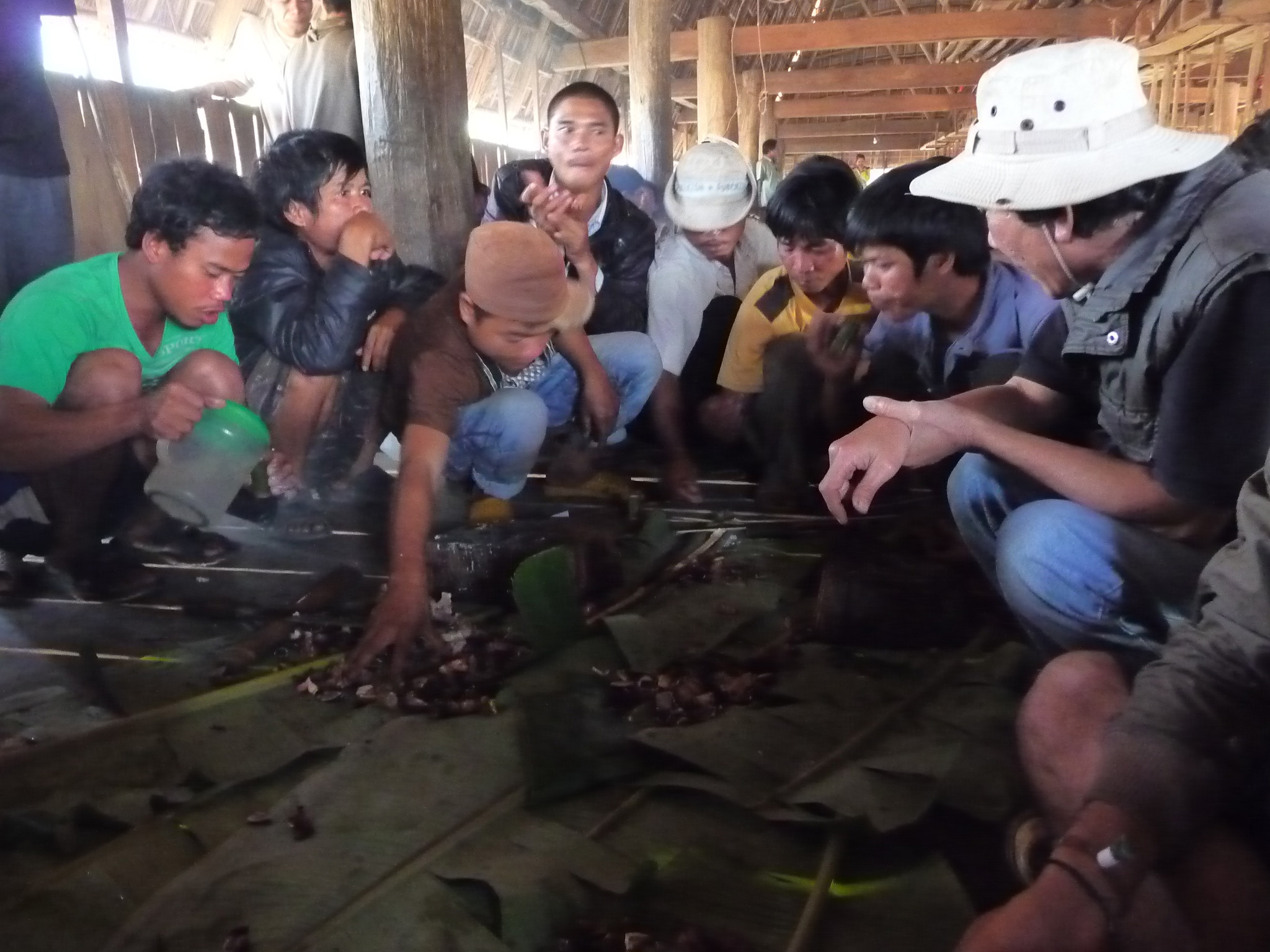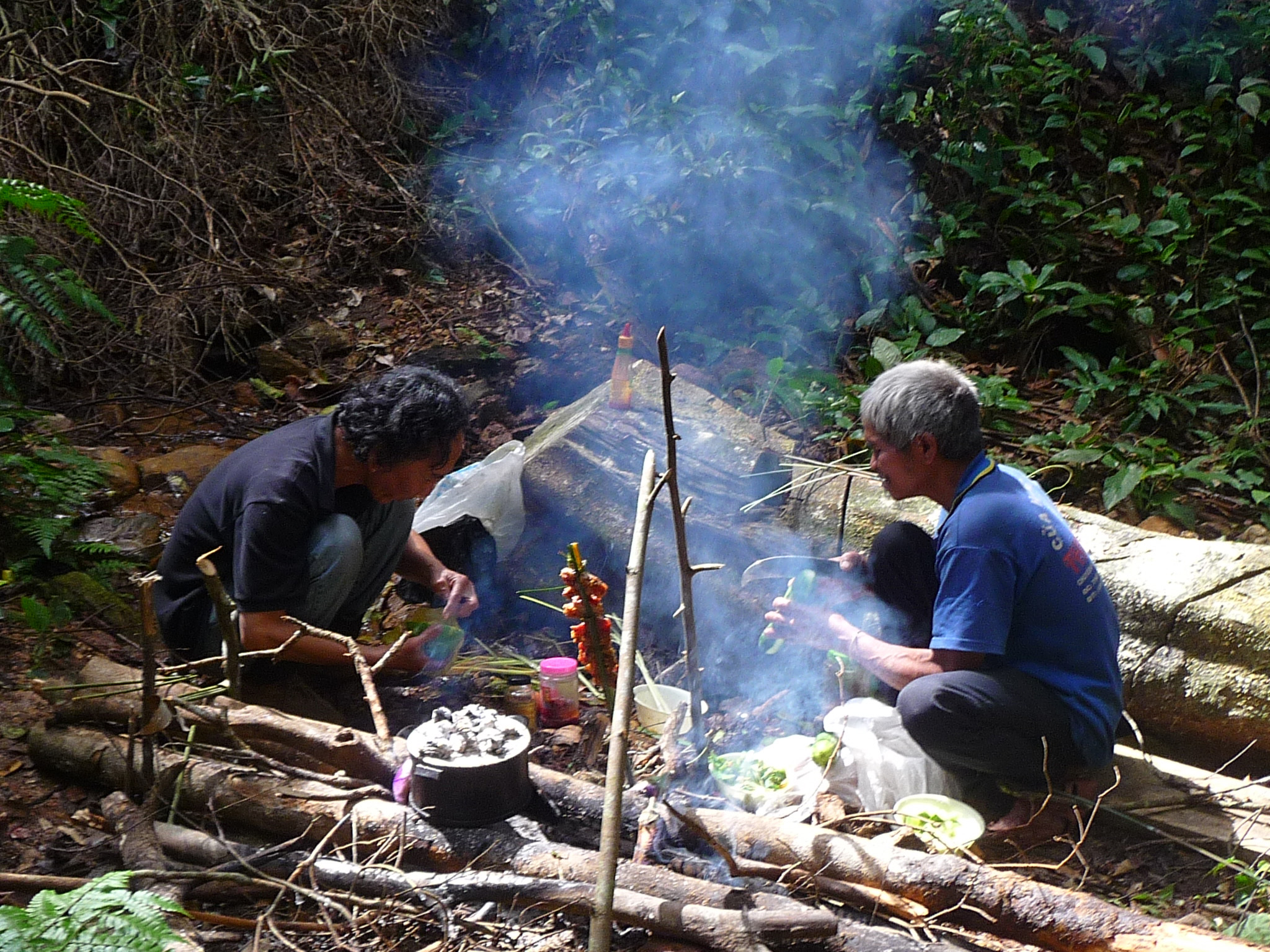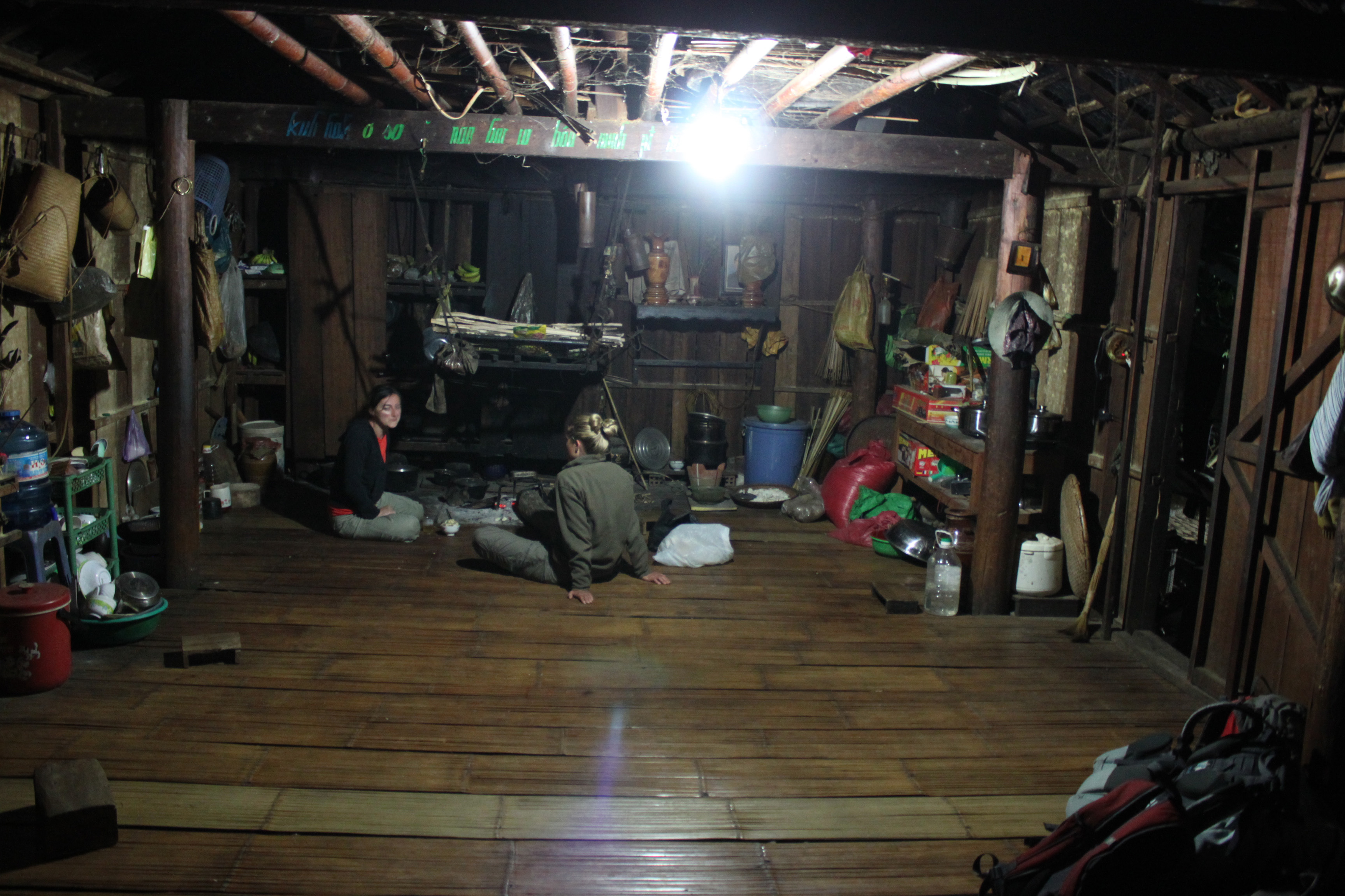 Unser Tourguide Mr. An kocht mit der Familie unser Abendessen: Reis, gegrilltes Schweinefleisch und ein Suppe aus zuvor gepflückten Blättern: köstlich. Wir genießen die Abenddämmerung über den Wipfeln und scharen uns um das Feuer: es wird recht kalt, sobald die Sonne hinter den Bergen untergegangen ist. Wir teilen selbstgemachten Reisschnaps; Som und Mr. An singen alte Bahnar-Lieder. An übersetzt uns die -oft- romantische Bedeutung der Lieder. Wir versuchen es im Gegenzug mit westlichem Liedgut. Gegen später wird die Schlafmatte in der Hütte am Feuer ausgerollt. Trotz Schlafsack: es wird ganz schön kalt sobald das Feuer aus ist, wahrscheinlich halten uns alle auch die ungewohnten Geräusche des Dschungels und des Viehs unter unserer Hütte wach.