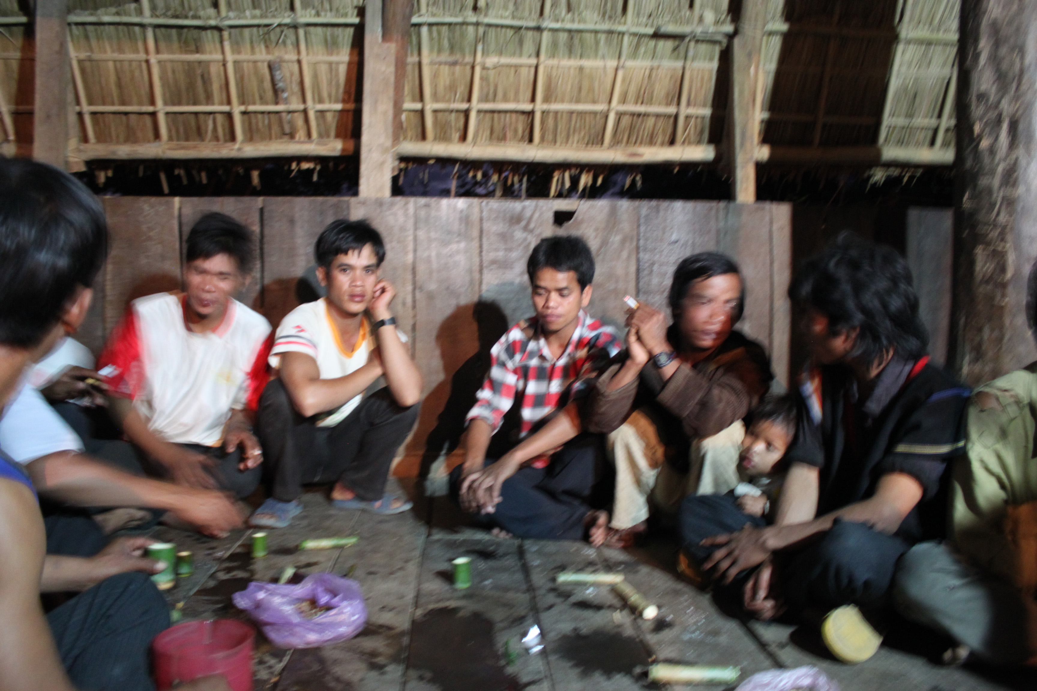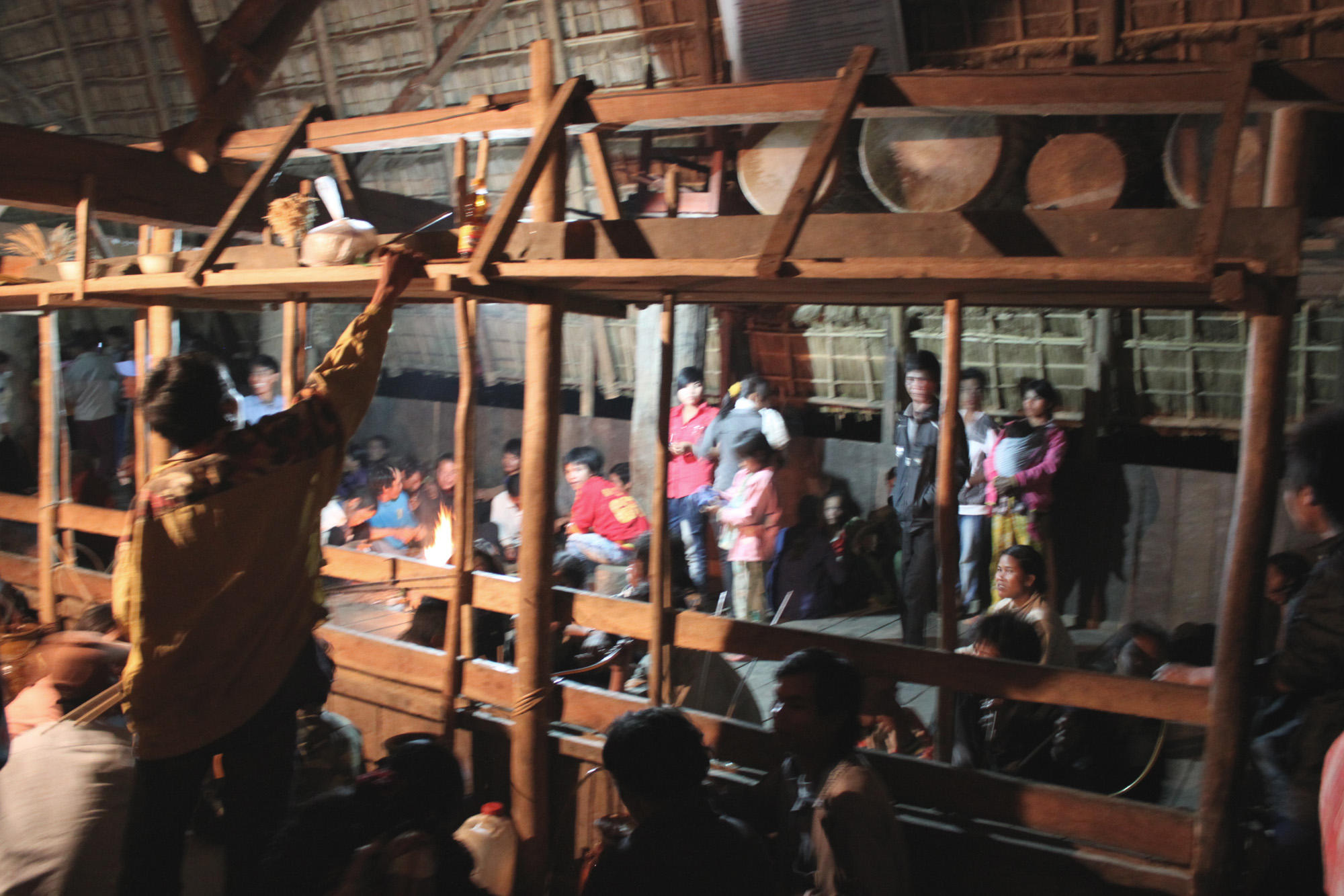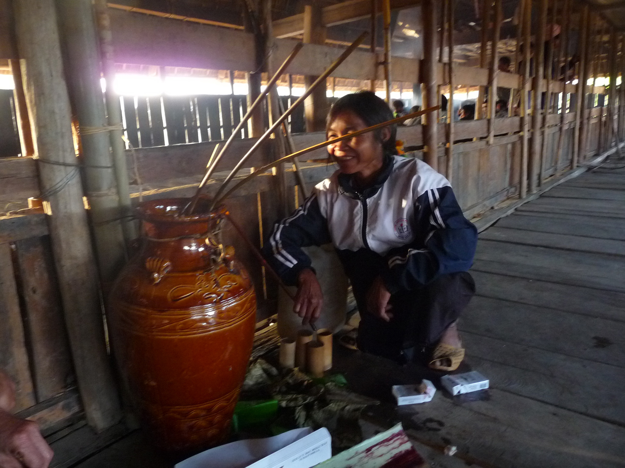 Gegen Abend kommen die Familien wieder zusammen und bringen selbst gemachten Reiswein in großen Tonkrügen mit, dazu das gebratenen Büffelfleisch. Entlang der Mittelachse sitzen die Familien mit ihrem Reiswein. Jeder hat ein anderes Rezept: Verschiedenste Kräuter und Korn geben unterschiedlichen Geschmack. Das ganze wird immer wieder mit Wasser aufgegossen. Getrunken wird direkt aus den Tonkrügen aus langen Bambusrohren. Eine Musiktruppe spielt traditionelle Gongmusik, gegen später kommt diese vom Band. Die ganze Nacht über wird getrunken, gegessen und getanzt. Jede Familie preist ihren Reisewein an, dazu gibt es wieder und wieder einen Happen Büffelfleisch. Wir werden überall am Ärmel gezupft, doch auch diesen und jenen Reiswein zu probieren.... eine lange unvergessliche Nacht.