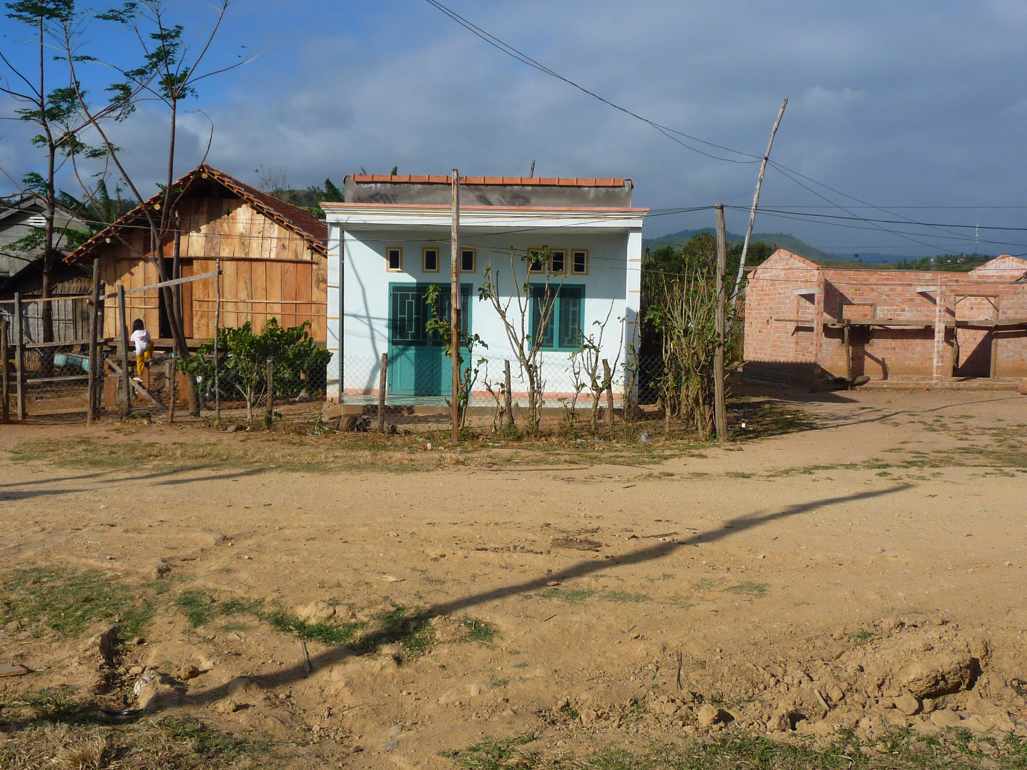 Unsere Trekking-Tour startet 40 km von Kontum im Bahnar-Dorf Kon Brap Dy. Im Dorf leben etwa 370 Familien (mit 10-15 Personen). Das große Gemeinschaftshaus mit dem bambus- und grasgedeckten hohen axtförmigen Dach -das Rong-Haus - befindet sich auf dem Marktplatz. Darum gruppieren sich traditionelle Langhäuer auf Stelzen und „neuere“ Steinhäuser. Fast alle Bewohner halten Schweine und Hühner im Hinterhof. Ein kleiner Laden verkauft das nötigste an Grundnahrungsmitteln, Getränken und Zigaretten.