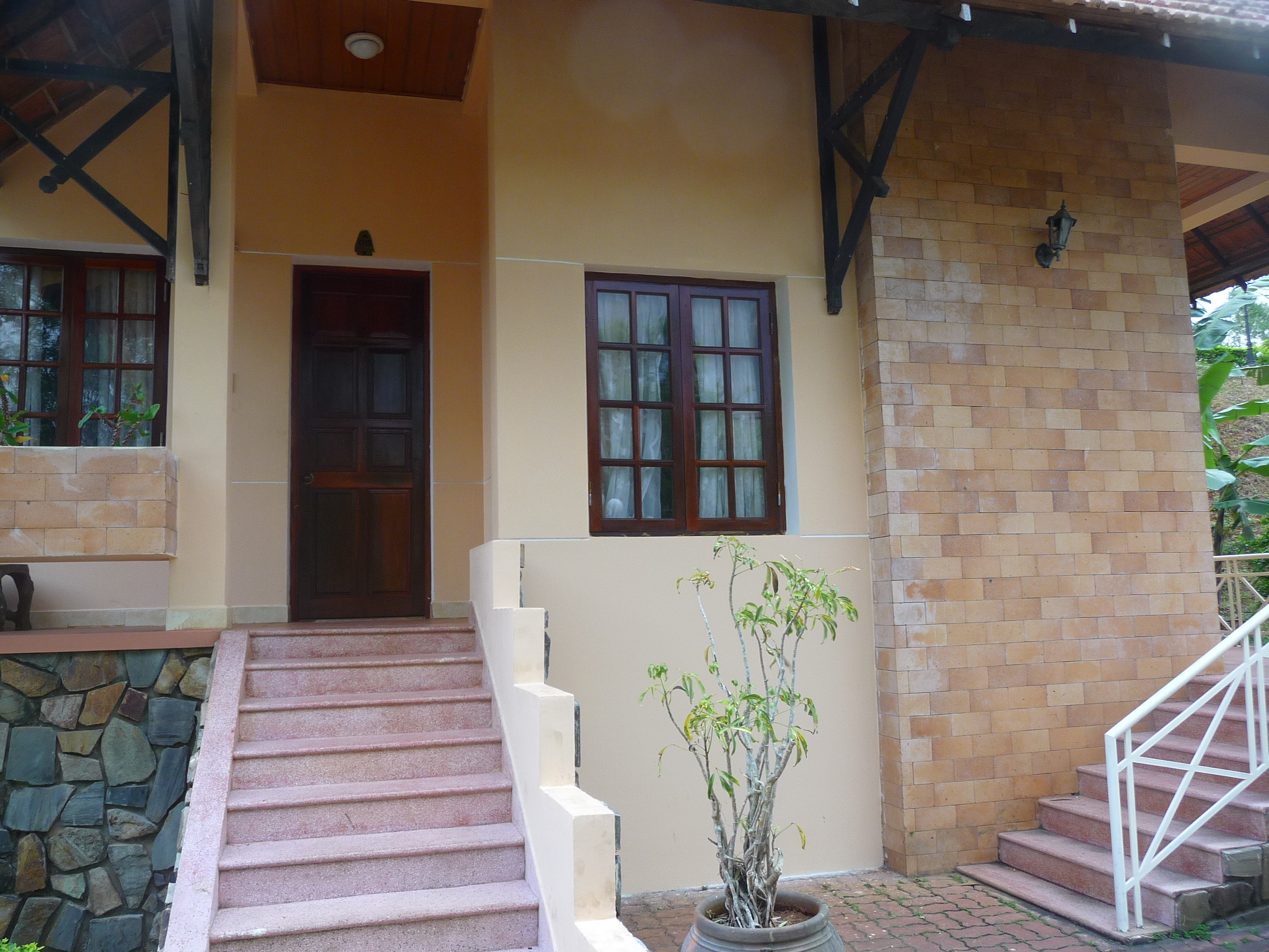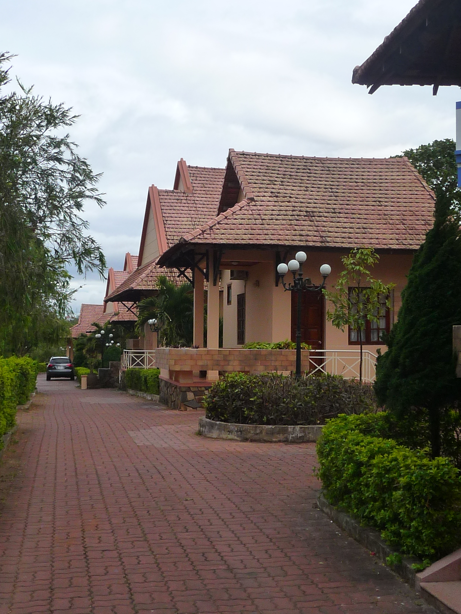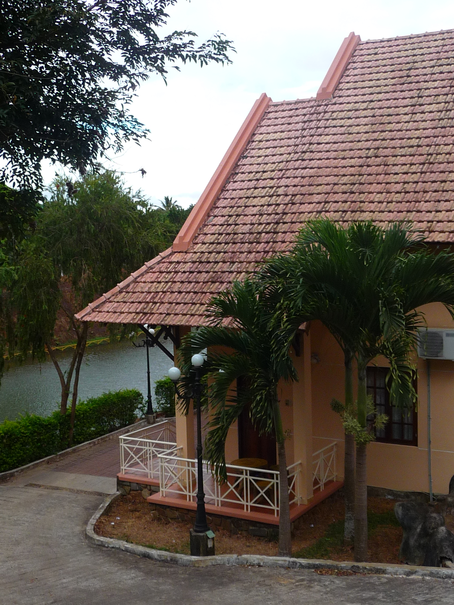 An einem schönen See reihen sich einige Steinbungalows mit Terrasse in einem gepflegten Garten aneinander, die mit Klimaanlage, Kühlschrank und TV ausgestattet sind.