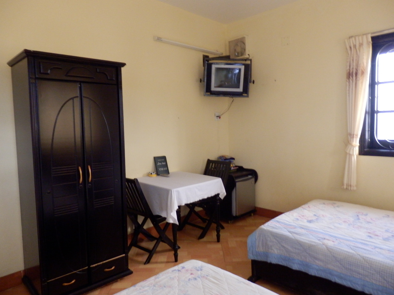 Die Zimmer sind ansprechend geräumig. Große Betten, einfache Matratzen, Tisch und Stühle, Kühlschrank und teils Badewanne. Wer Glück hat, ergattert ein Zimmer mit Meerblick.
