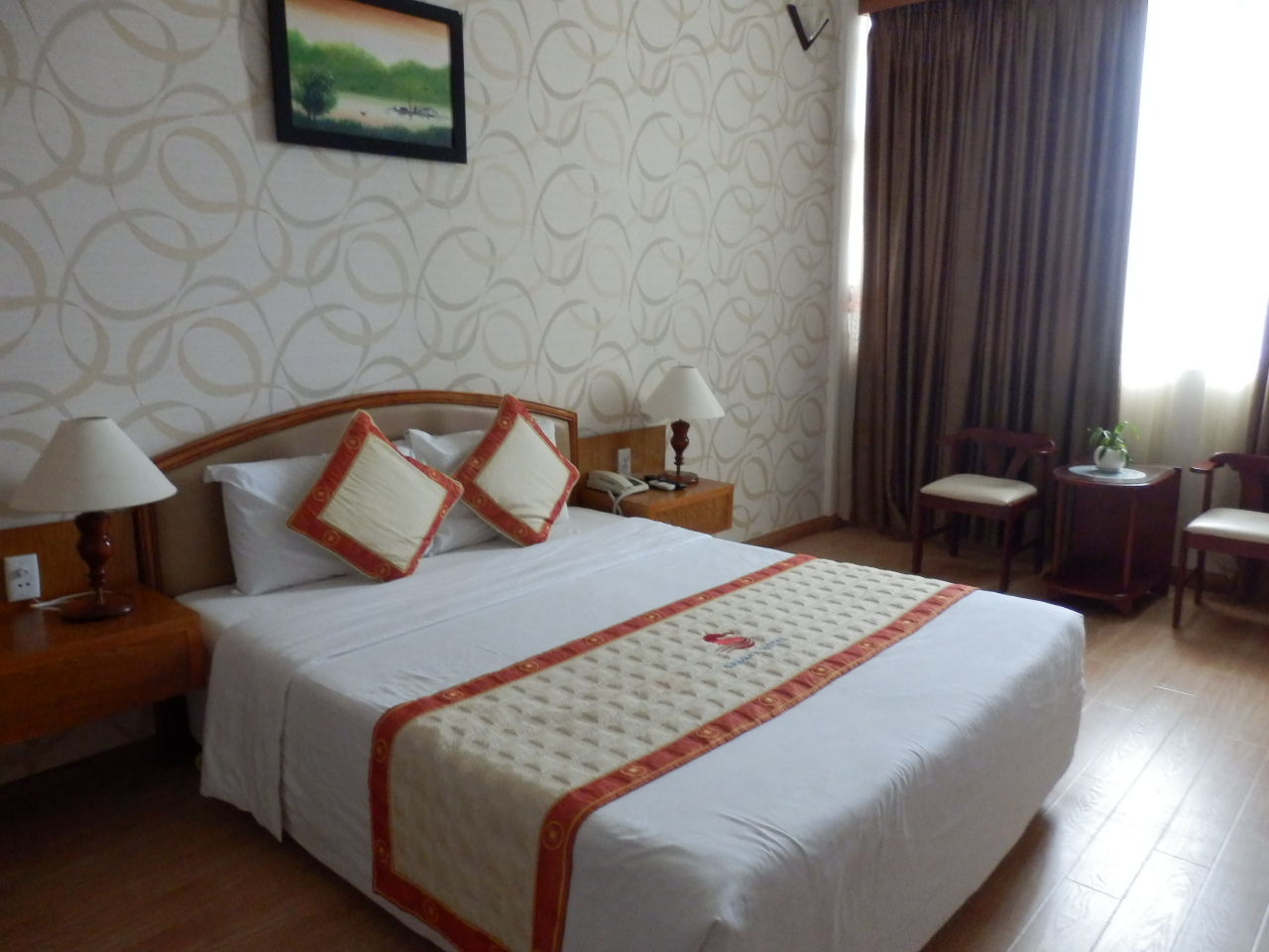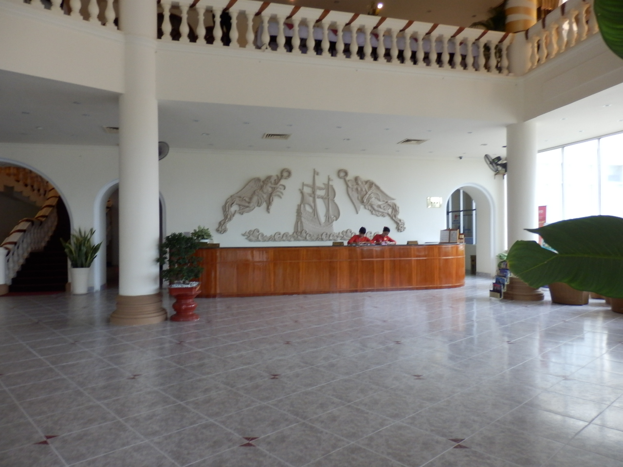Großes 119 Zimmer Hotel am Bai Sau Strand. Hotellobby und Zimmer sprechen sehr den asiatischen Geschmack an: kühle Atmosphäre und minimale Einrichtung. Minibar und TV vorhanden.